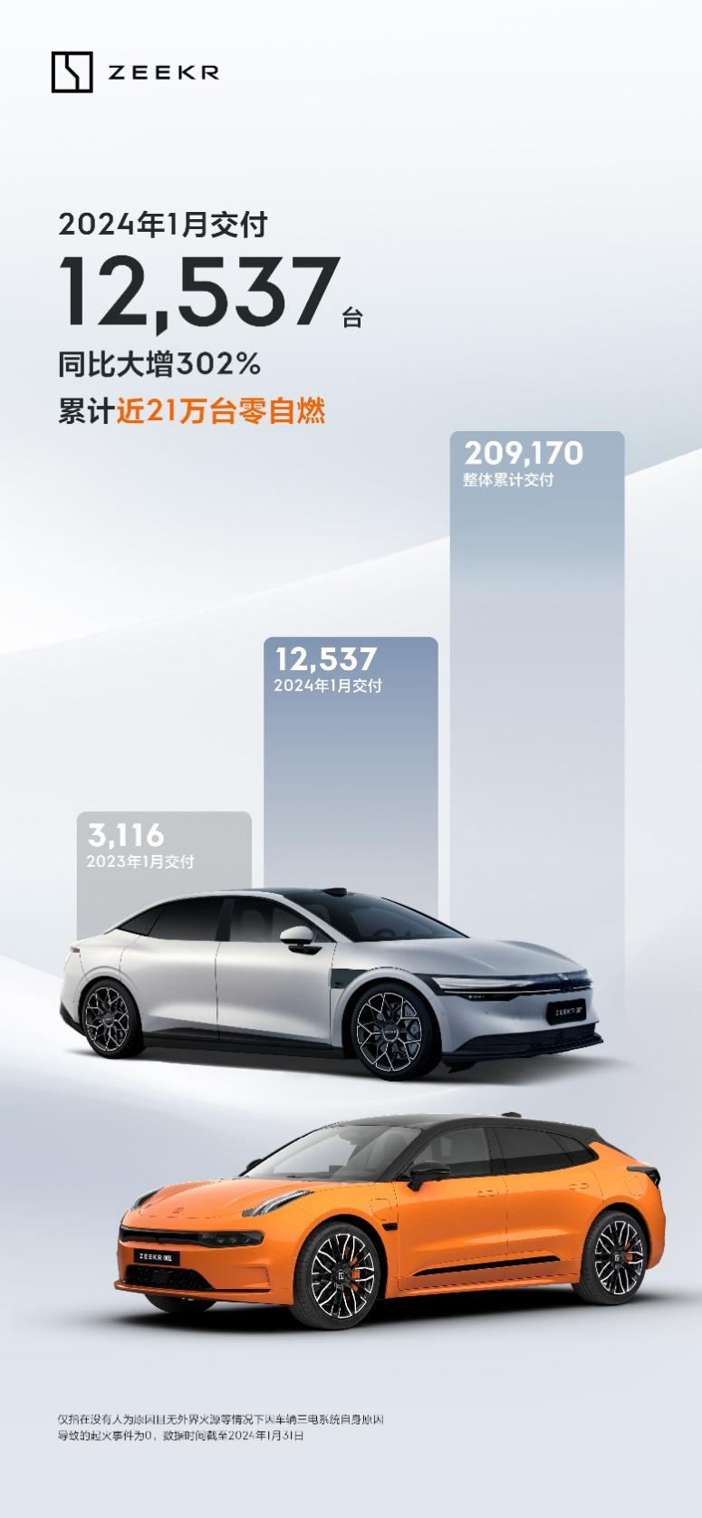 2月1日,極氪智能科技公布最新交付量。2024年1月份交付12537臺(tái),同比大增302%。新車型極氪007上市即交付,帶動(dòng)品牌勢(shì)能大漲,實(shí)現(xiàn)新年開門紅。截至目前,極氪累計(jì)交付近21萬臺(tái)零自燃,持續(xù)刷新全球電動(dòng)車安全上限。
