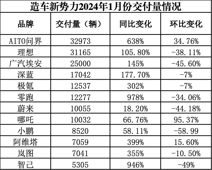 相比2023年12月份,造車(chē)新勢(shì)力1月份交付量整體下滑了大約30%,部分車(chē)企更是超過(guò)50%。