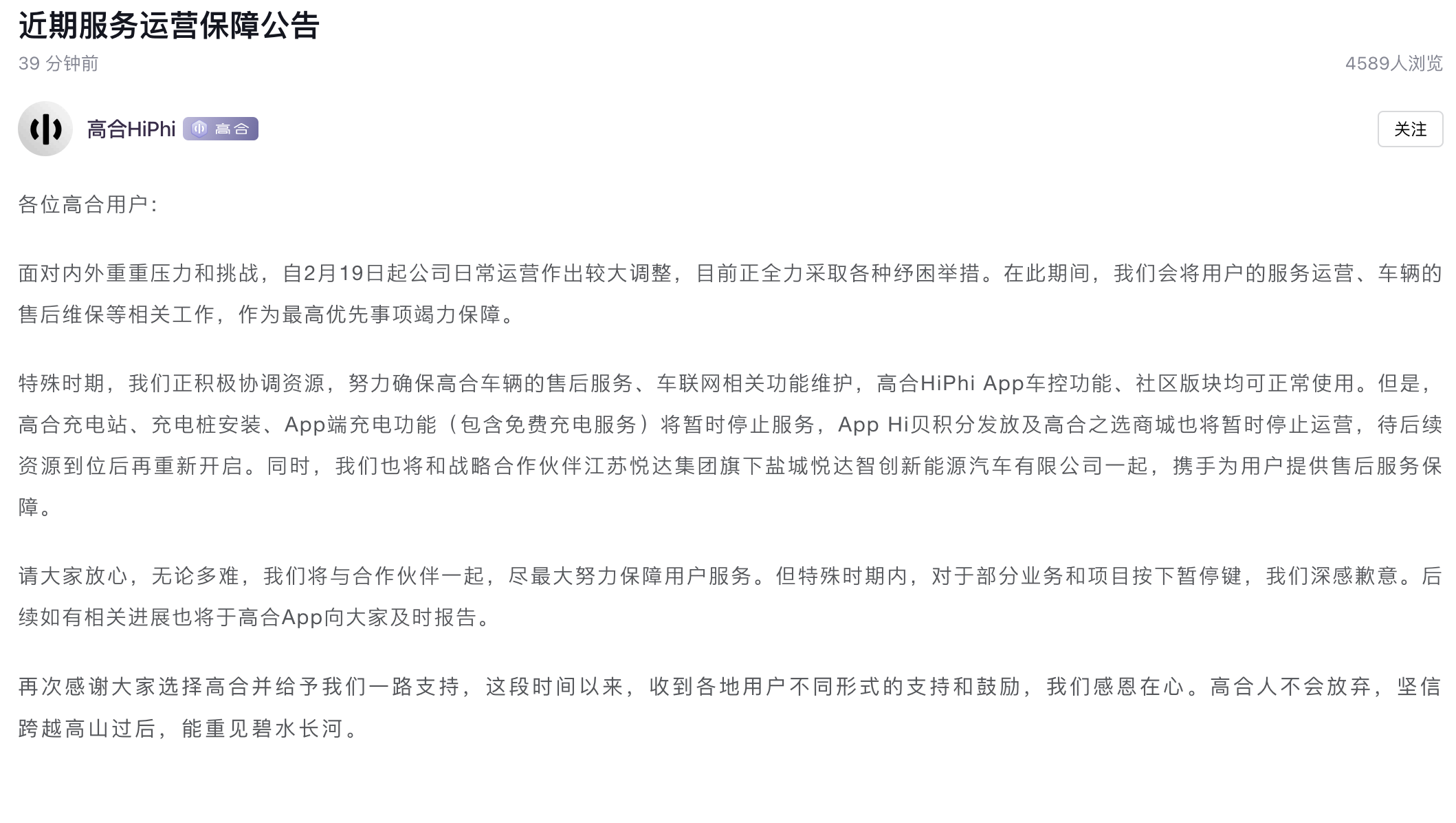 據(jù)高合汽車發(fā)布的最新公告,公司正積極協(xié)調(diào)資源,努力確保高合車輛的售后服務(wù)、車聯(lián)網(wǎng)相關(guān)功能維護(hù),高合HiPhiApp車控功能、社區(qū)版塊仍可正常使用。但是,高合充電站、充電樁安裝、App端充電功能(包含免費充電服務(wù))將暫時停止服務(wù),AppHi貝積分發(fā)放及高合之選商城也將暫時停止運營,待后續(xù)資源到位后再重新開啟。