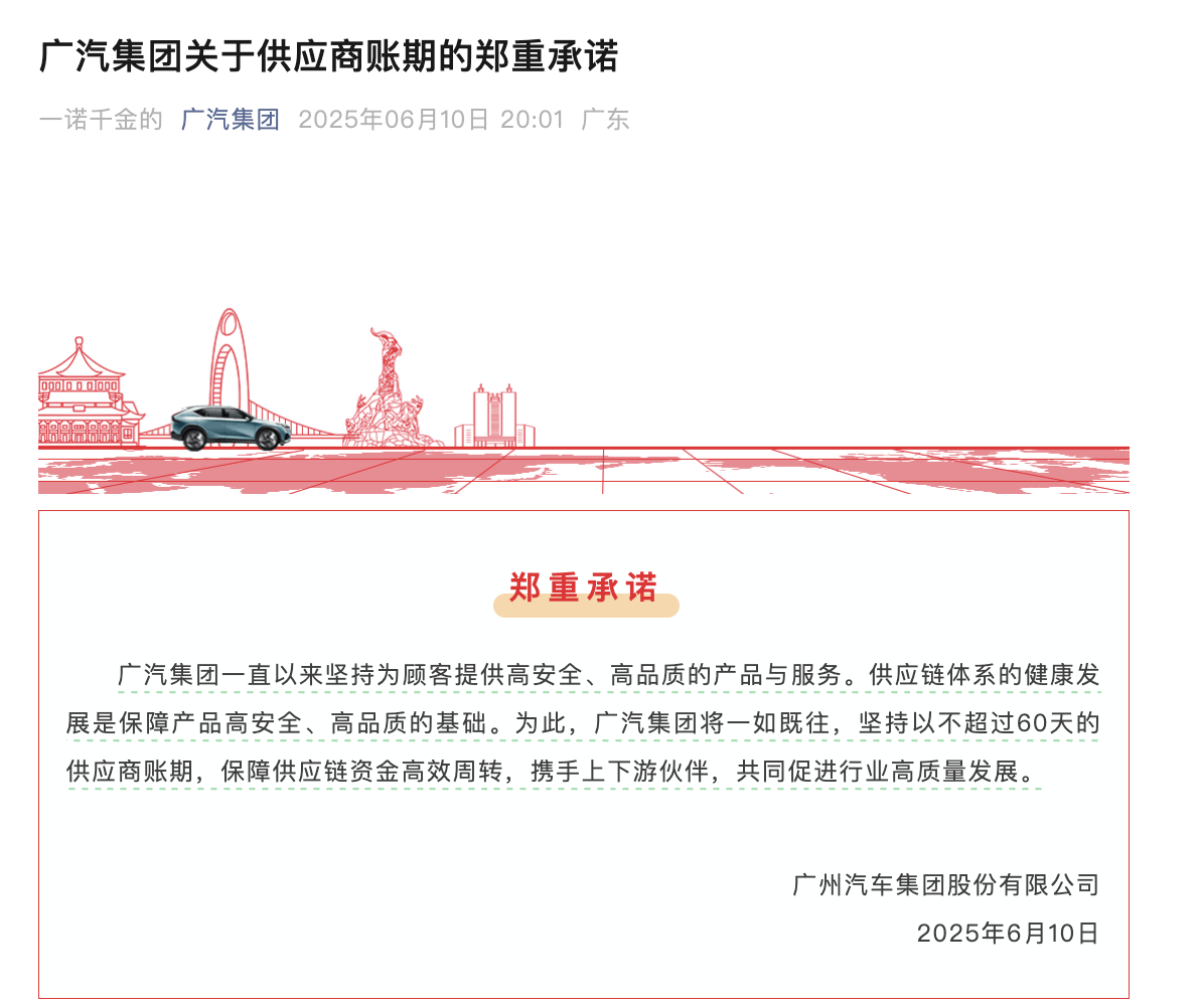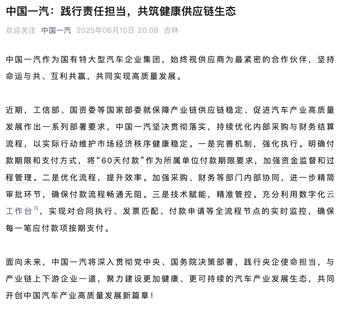 6月10日晚間,中國(guó)第一汽車(chē)集團(tuán)有限公司、東風(fēng)汽車(chē)集團(tuán)有限公司、廣州汽車(chē)集團(tuán)股份有限公司、賽力斯集團(tuán)股份有限公司率先做出承諾將供應(yīng)商支付賬期統(tǒng)一嚴(yán)格限定在60天以內(nèi)。隨后吉利汽車(chē)集團(tuán)有限公司、重慶長(zhǎng)安汽車(chē)股份有限公司、比亞迪股份有限公司、奇瑞汽車(chē)股份有限公司、小鵬汽車(chē)有限公司等車(chē)企跟進(jìn)。這不僅是響應(yīng)《條例》的強(qiáng)制要求,更是行業(yè)領(lǐng)軍者挺身而出,以實(shí)際行動(dòng)抵制惡性競(jìng)爭(zhēng)、修復(fù)產(chǎn)業(yè)生態(tài)的反內(nèi)卷宣言。