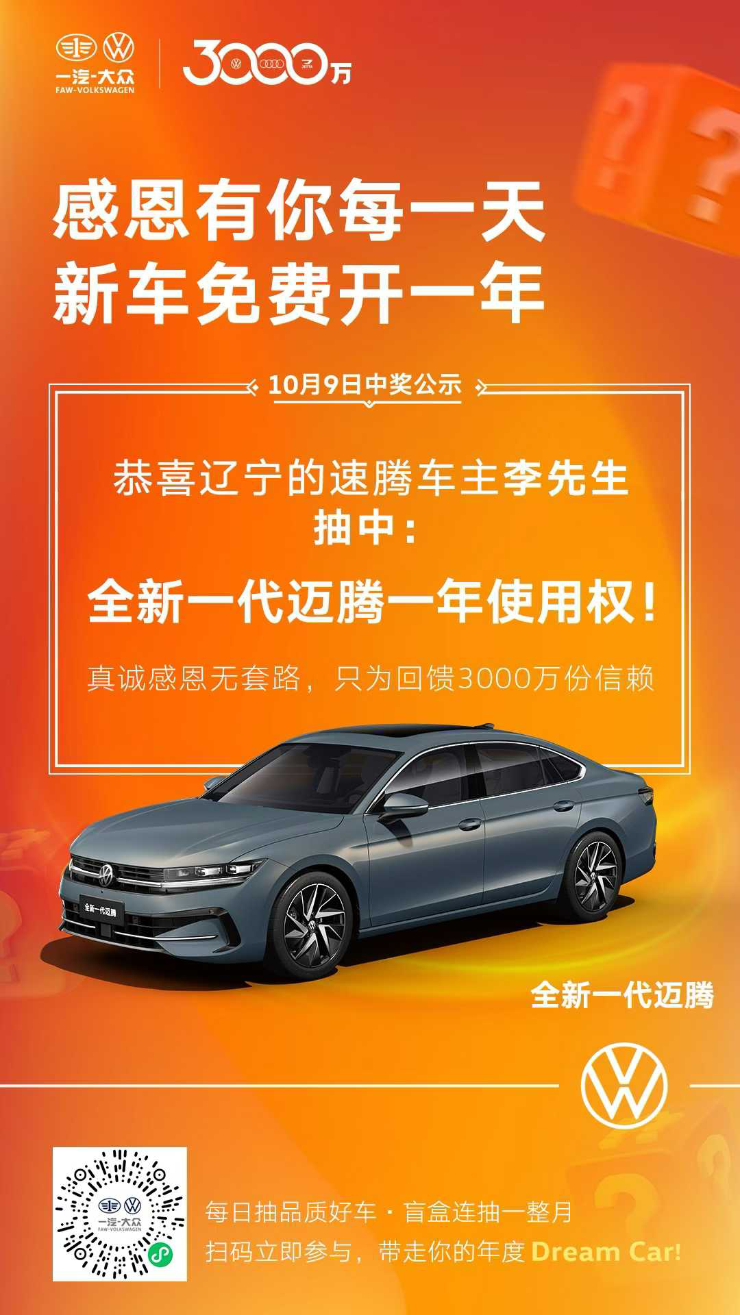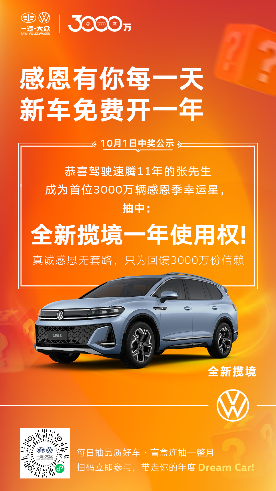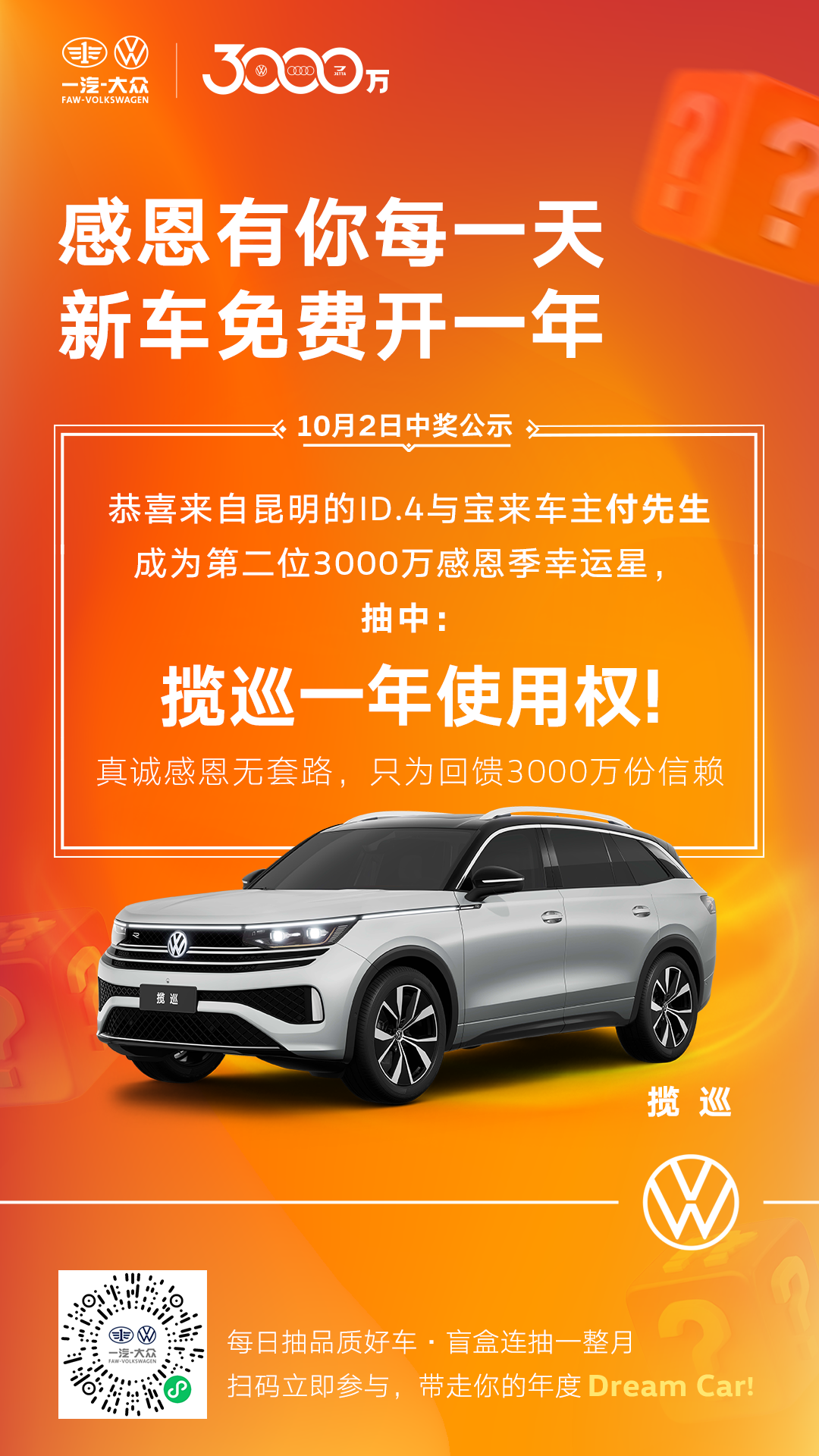 規(guī)模之上是責任,這份責任既是對品質(zhì)的堅守,也是對客戶的承諾,一汽-大眾將“可靠”從產(chǎn)品品質(zhì)延伸至服務領域。為答謝3000萬客戶的支持與信賴,一汽-大眾特別推出“3000萬用戶感恩禮”——車主報名抽取新車“免費開一年”使用權(quán),大眾品牌吸引超過64000位車主報名參與。十一長假期間共誕生八位“幸運星”,分別獲得全新攬境、攬巡、全新探岳L、全新一代速騰L及全新一代邁騰車型的一年使用權(quán)。目前該活動仍在火熱進行中,10月27日前仍可報名參與。