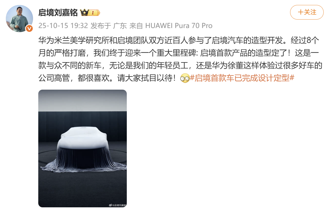 本報(bào)訊 (記者賈麗)10月16日消息,啟境汽車CEO劉嘉銘近日發(fā)布微博表示,由廣汽集團(tuán)與華為聯(lián)合打造的高端智能新能源汽車品牌“啟境”宣布其首款車型已完成設(shè)計(jì)定型。此次設(shè)計(jì)定型歷時(shí)8個(gè)月,經(jīng)過了數(shù)十輪的設(shè)計(jì)評(píng)審,得到了雙方團(tuán)隊(duì)的高度認(rèn)可。