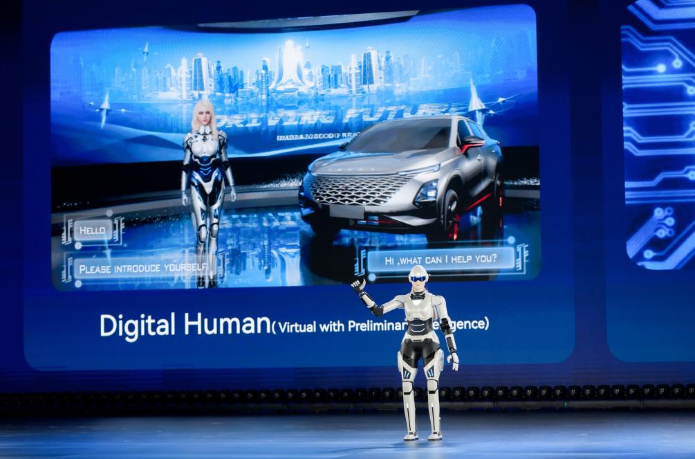 圖為奇瑞墨甲機(jī)器人“墨茵”登臺(tái)演講