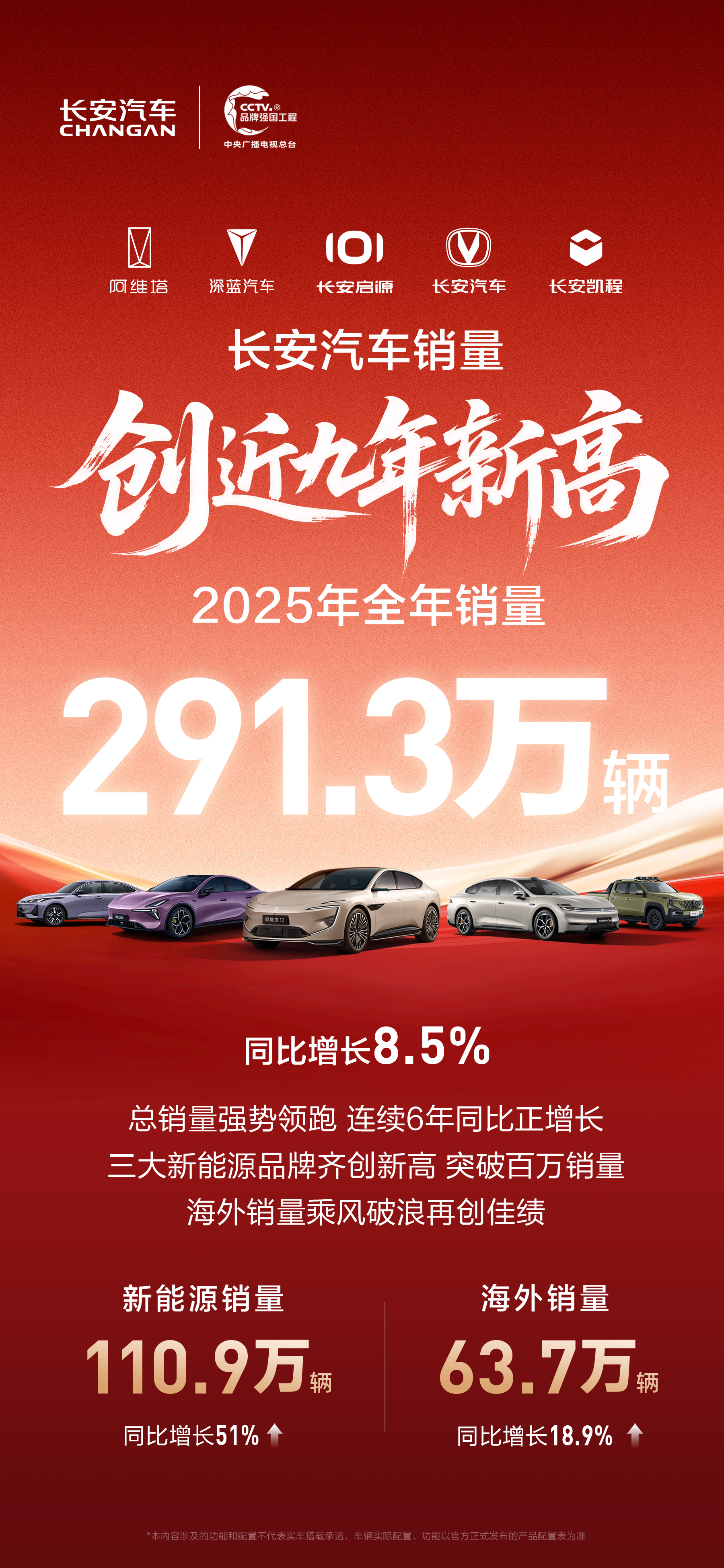 本報(bào)訊 (記者馮雨瑤)在2025年汽車行業(yè)競(jìng)爭(zhēng)白熱化的市場(chǎng)環(huán)境中,長(zhǎng)安汽車以一系列突破性業(yè)績(jī),提交了一份企業(yè)穩(wěn)健向上的出色答卷。2026年1月2日發(fā)布的銷量快報(bào)顯示,長(zhǎng)安汽車2025年全年總銷量強(qiáng)勢(shì)領(lǐng)跑,創(chuàng)近9年新高。與此同時(shí),新能源板塊首破百萬(wàn)輛大關(guān),三大新能源品牌齊創(chuàng)新高;海外市場(chǎng)亦乘風(fēng)破浪,再創(chuàng)佳績(jī)。2025年,長(zhǎng)安汽車以“四大維度齊創(chuàng)新高”的優(yōu)秀成績(jī),系統(tǒng)展現(xiàn)了企業(yè)高質(zhì)量發(fā)展的強(qiáng)勁勢(shì)頭和可持續(xù)發(fā)展的戰(zhàn)略韌性。