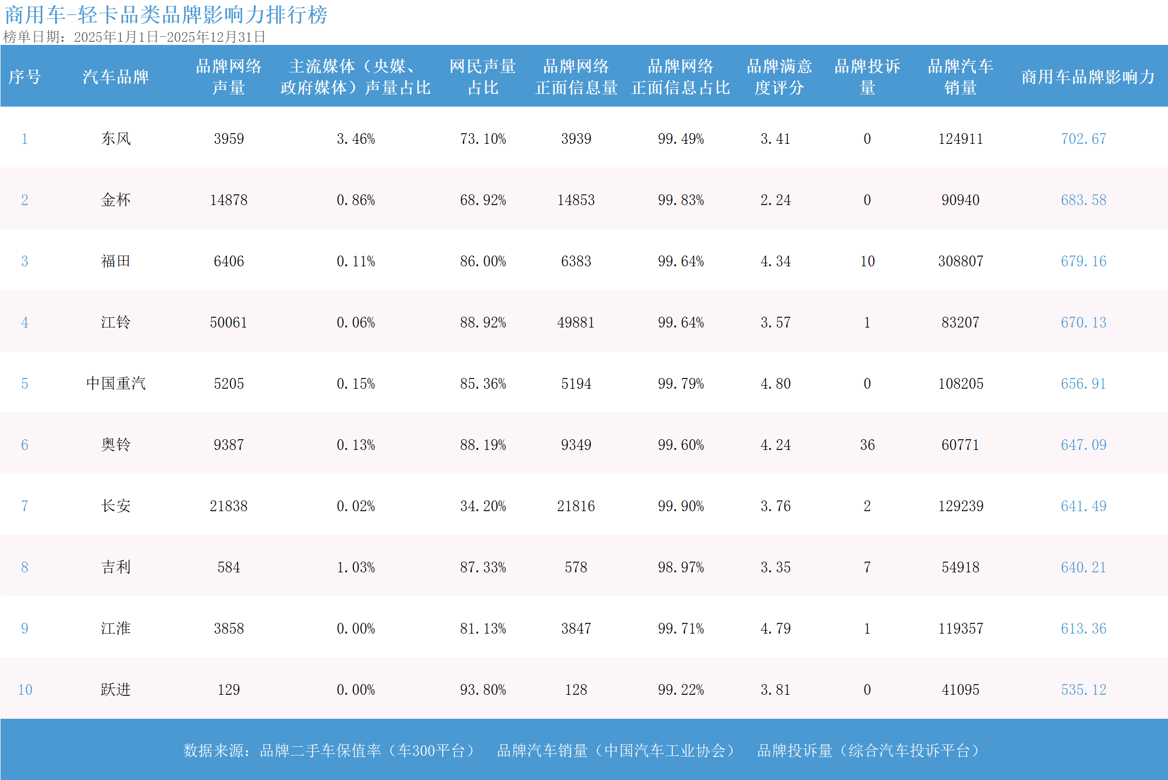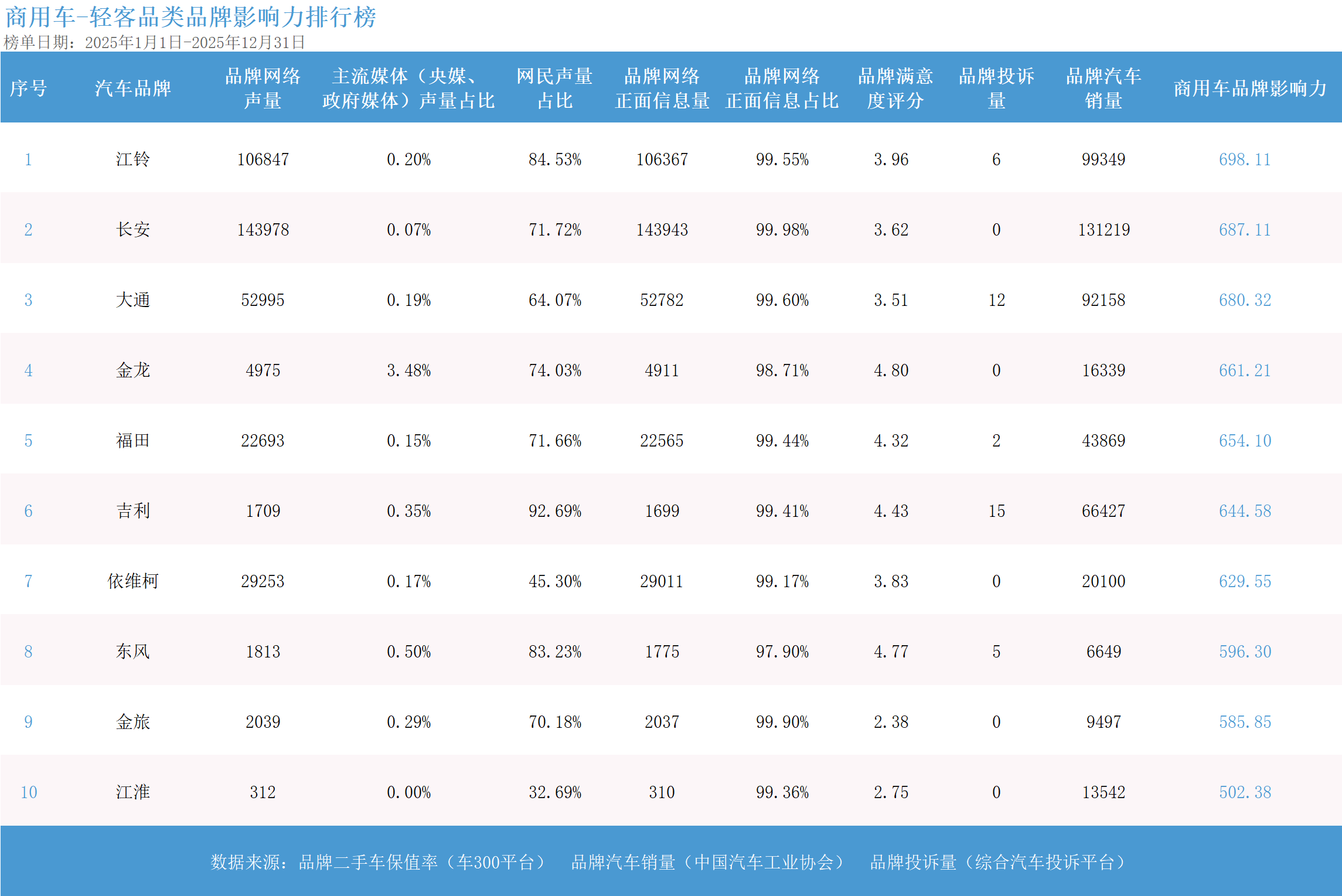 而在輕客市場,江鈴汽車以698.11分再度領(lǐng)跑,其高達99.55%的正面信息占比與接近10萬輛的年度銷量,生動詮釋了在B端客戶市場中,以“可靠”和“低使用成本”為核心建立的品牌信任所帶來的巨大商業(yè)價值;長安凱程則以超過13萬輛的銷量規(guī)模緊隨其后,并在新能源輕客車型上實現(xiàn)了快速增長,展現(xiàn)出強大的市場適應力。