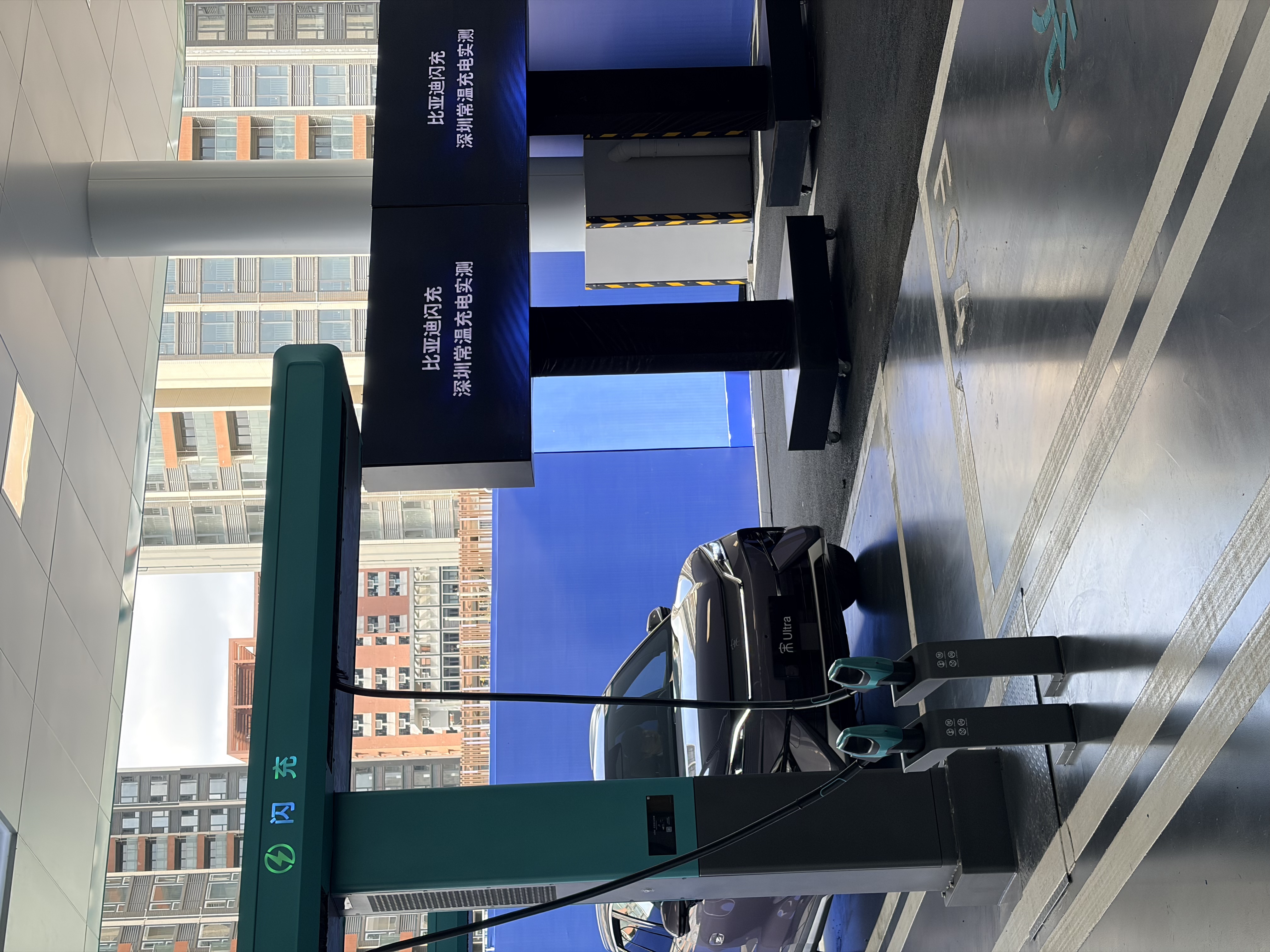 為實(shí)現(xiàn)第二代刀片電池的閃充速度,比亞迪還全新開發(fā)了閃充樁,采用了“滑軌懸吊式T型樁”設(shè)計(jì),槍線保持懸空,用戶可左右滑動進(jìn)行充電。閃充樁單槍充電功率做到了1500kW,結(jié)合超級快放的儲能系統(tǒng),突破了電網(wǎng)容量限制。