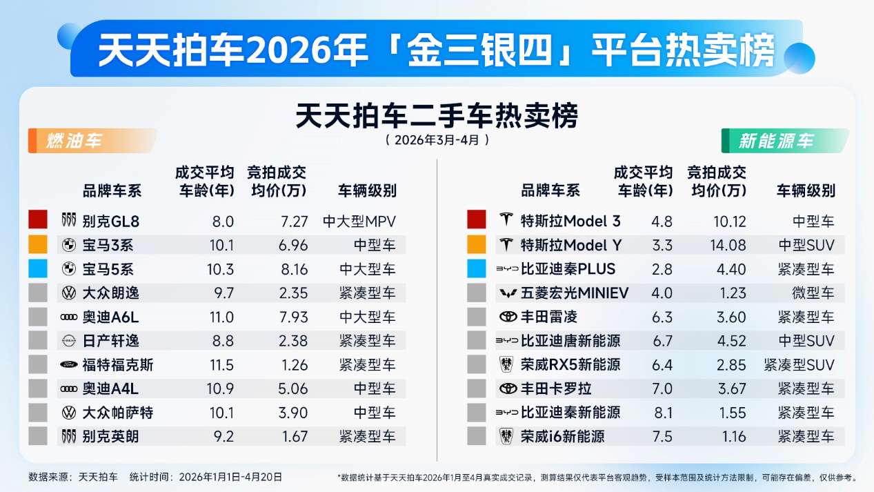 本報(bào)訊 (記者劉釗)3月隨著春節(jié)假期結(jié)束,二手車商全面復(fù)工,二手車平臺(tái)交易也步入正軌,消費(fèi)需求持續(xù)釋放,市場(chǎng)進(jìn)入穩(wěn)步復(fù)蘇期,加速回暖。近日,國內(nèi)領(lǐng)先的二手車交易在線服務(wù)平臺(tái)——天天拍車發(fā)布了2026年“金三銀四”平臺(tái)熱賣榜,以大量真實(shí)成交的數(shù)據(jù)為基礎(chǔ),給出了2026年3月至4月二手車交易通過全國在線競(jìng)拍模式高效賣車激發(fā)市場(chǎng)升溫的信號(hào)。榜單揭示了當(dāng)前經(jīng)濟(jì)實(shí)用型的代步車型正成為賣車行情中的成交主力,車主也更有機(jī)會(huì)提高賣車收益。