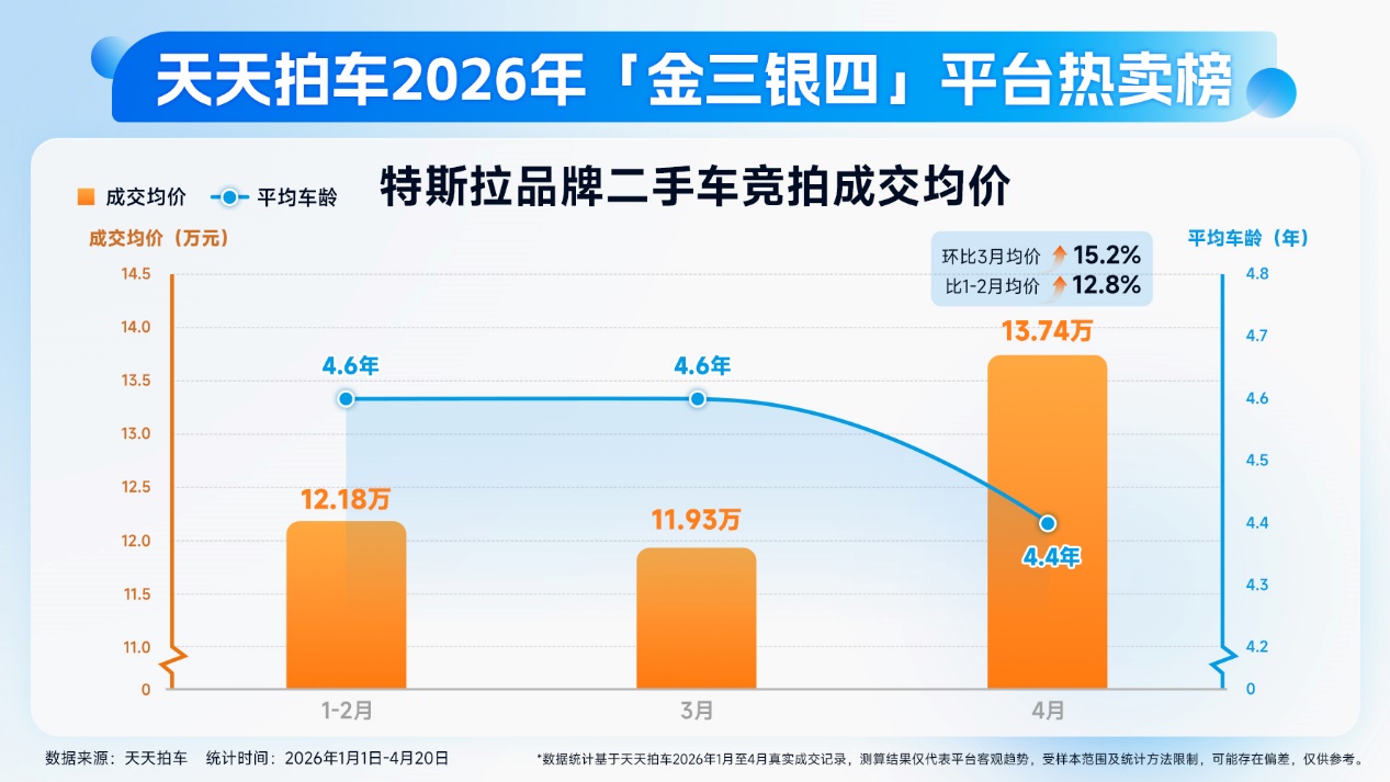 新能源二手車交易旺,熱門新能源車的成交價(jià)格也有一定上漲。榜單數(shù)據(jù)顯示,長期“霸榜”熱賣新能源品牌榜單——特斯拉4月二手車競(jìng)拍成交均價(jià)為13.74萬元,比3月以及1-2月分別增長15.2%和12.8%,車主收益空間明顯擴(kuò)大??傮w來看,個(gè)人車主完全不必?fù)?dān)心10萬元以內(nèi)價(jià)位的舊車失去交易潛力,天天拍車的真實(shí)成交數(shù)據(jù)顯示,此類車源反而能憑借使用成本低、廣適配場(chǎng)景的特點(diǎn),獲得穩(wěn)定的價(jià)格支撐,通過競(jìng)拍直連買家的方式釋放更多溢價(jià)空間,也更容易成為現(xiàn)實(shí)收益。