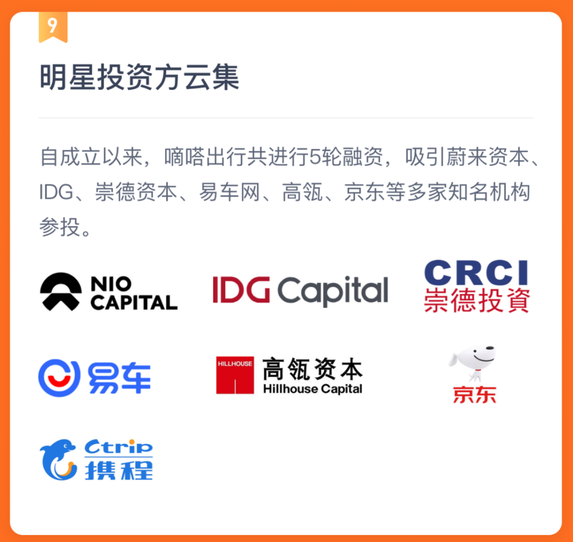 作為中國第二大順風(fēng)車平臺(tái),嘀嗒出行擁有豪華股東陣容,吸引多家知名投資機(jī)構(gòu)和企業(yè)參投,包括蔚來資本、IDG、CRCI、易車網(wǎng)、高瓴、京東及攜程等。