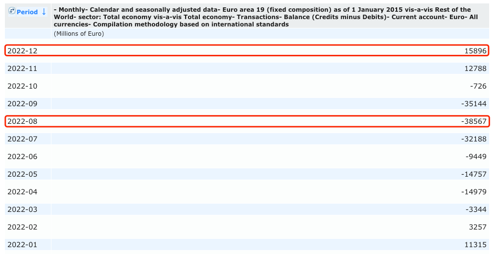 值得一提的是,在去年3月份至10月份,歐元區(qū)經(jīng)常賬戶月度數(shù)據(jù)持續(xù)錄得逆差,在去年8月份達(dá)到峰值385.67億歐元逆差。2022年全年,歐元區(qū)經(jīng)常賬戶逆差累計(jì)達(dá)到約1060億歐元,相當(dāng)于歐元區(qū)GDP的0.8%。2021年則為順差2820億歐元(相當(dāng)于GDP的2.3%)。