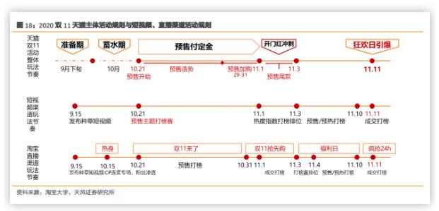 而2019年“雙11”規(guī)則,10.21-11.10為預(yù)售定金支付階段,11.11當(dāng)天才是正式活動(dòng)也即尾款支付階段,相比之下新的規(guī)則中第一次尾款支付時(shí)間提前了10天。