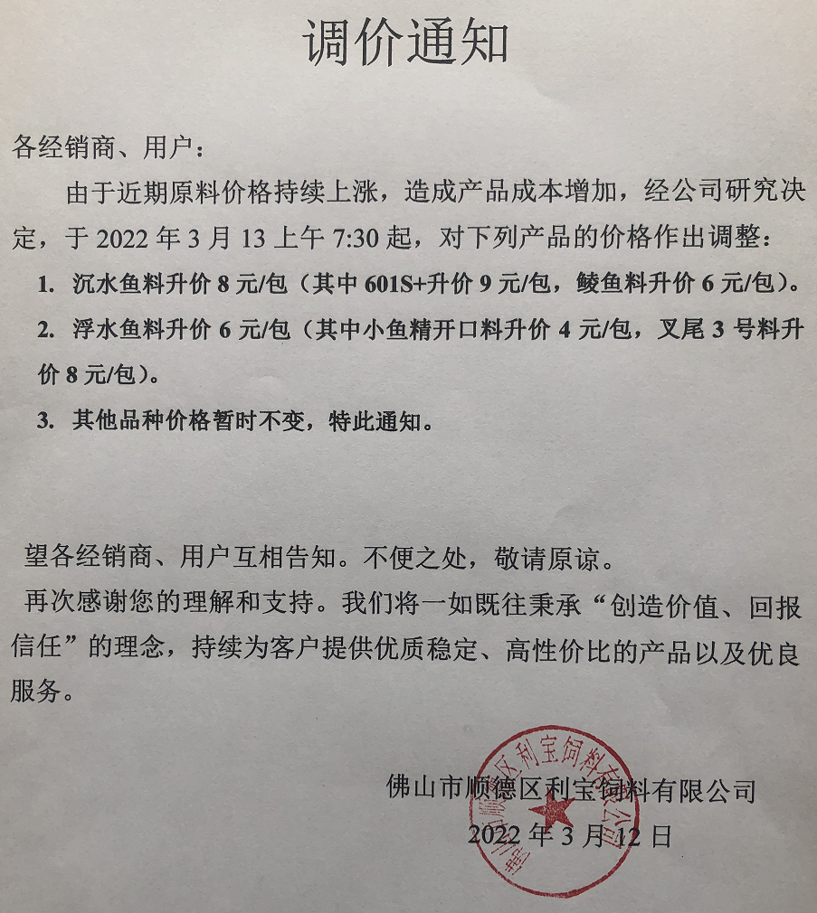 順德利寶水產(chǎn)飼料調(diào)價(jià)函
