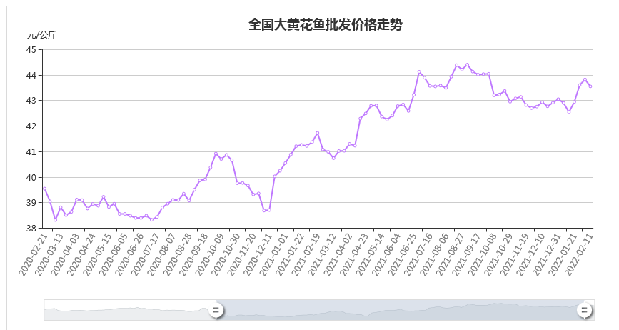 全國(guó)大黃花魚(yú)批發(fā)價(jià)格尚處于高位(國(guó)家商務(wù)部數(shù)據(jù)中心)