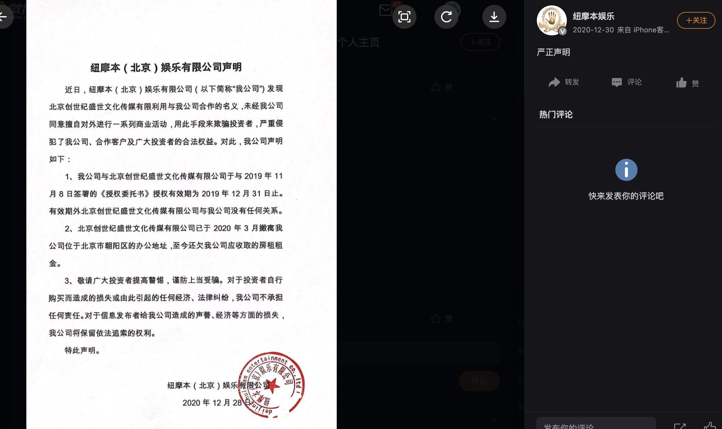 令人意外的是,2020年12月28日,紐摩本官方微博曾發(fā)布聲明稱(chēng):我公司2019年11月8日與創(chuàng)世紀(jì)簽署的《授權(quán)委托書(shū)》授權(quán)有效期為2019年12月31日止,有效期外創(chuàng)世紀(jì)與紐摩本沒(méi)有任何關(guān)系。