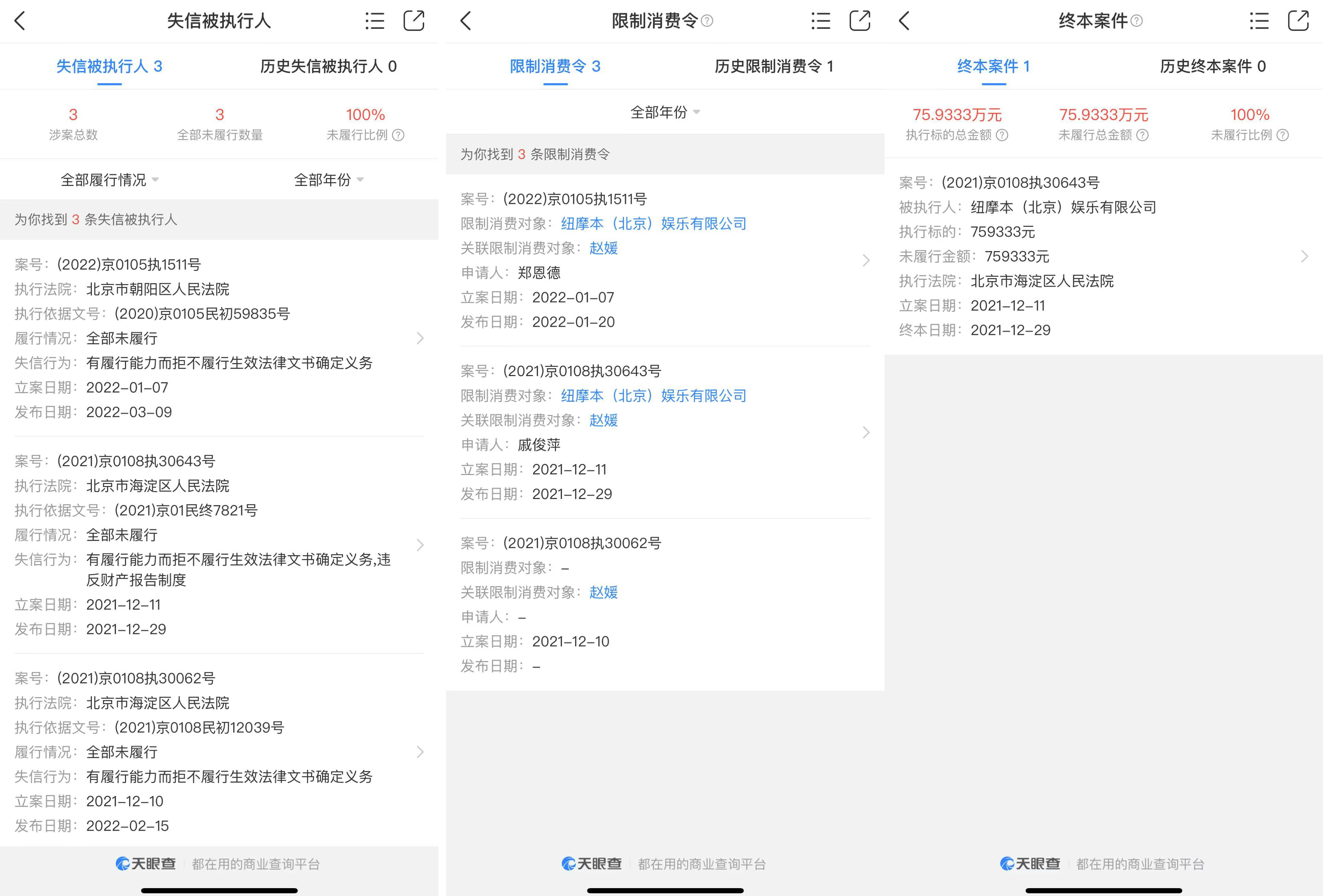 天眼查App顯示,創(chuàng)世紀(jì)涉及法律訴訟7起,七成以上是合同糾紛,其中6起處于一審狀態(tài)。而紐摩本涉及法律訴訟17起,其中11起處于一審狀態(tài),均為合同糾紛,2021年12月1日紐摩本已被列為限制高消費(fèi)企業(yè),同月被列為失信執(zhí)行人。當(dāng)前,紐摩本被執(zhí)行總金額85.52萬(wàn)元,終本案件1起,被執(zhí)行總金額75.93萬(wàn)元,法人趙媛也被“限高”。