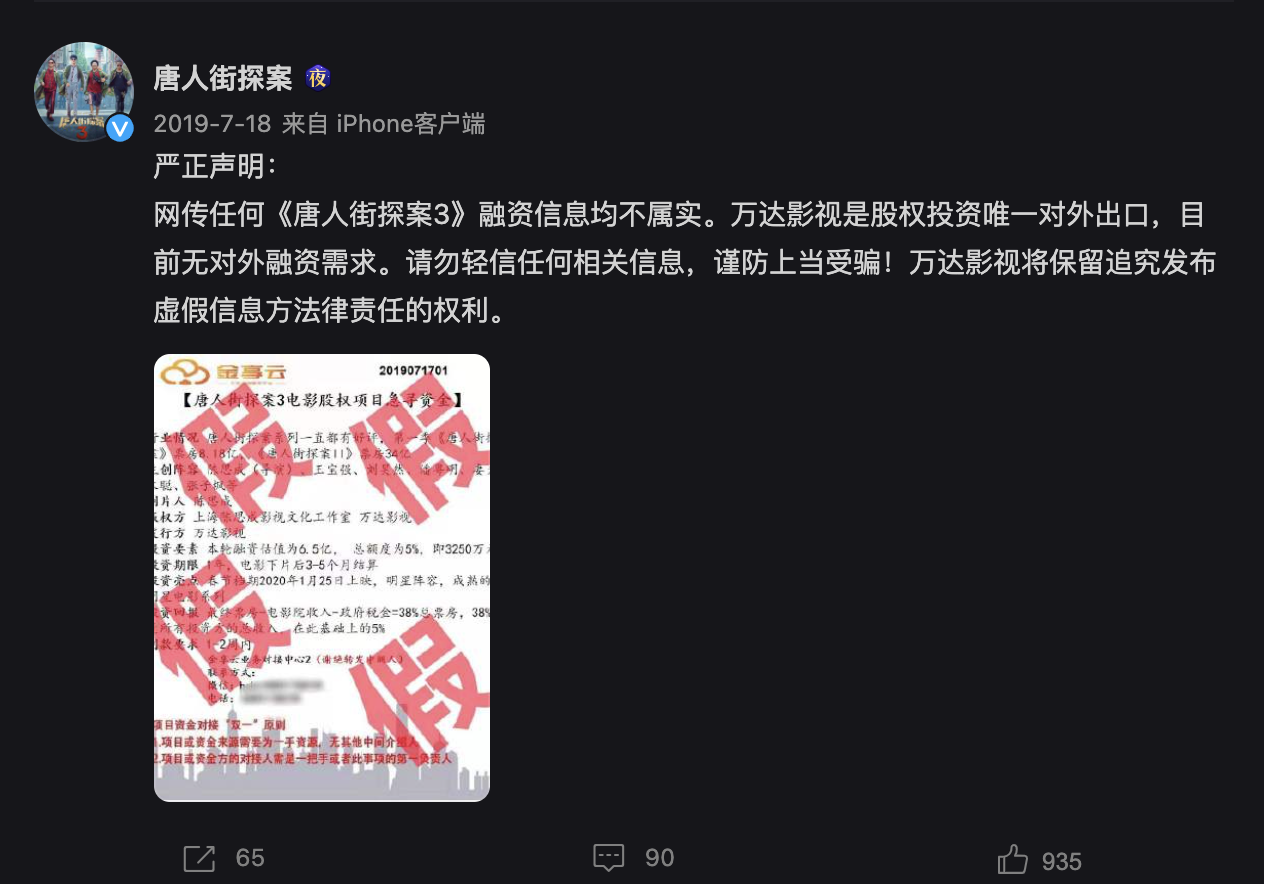 早在2019年7月份,《唐人街探案》官方微博就公開(kāi)表示:“網(wǎng)傳任何《唐探3》融資信息均不屬實(shí)。萬(wàn)達(dá)影視是股權(quán)投資唯一對(duì)外出口,目前無(wú)對(duì)外融資需求。”