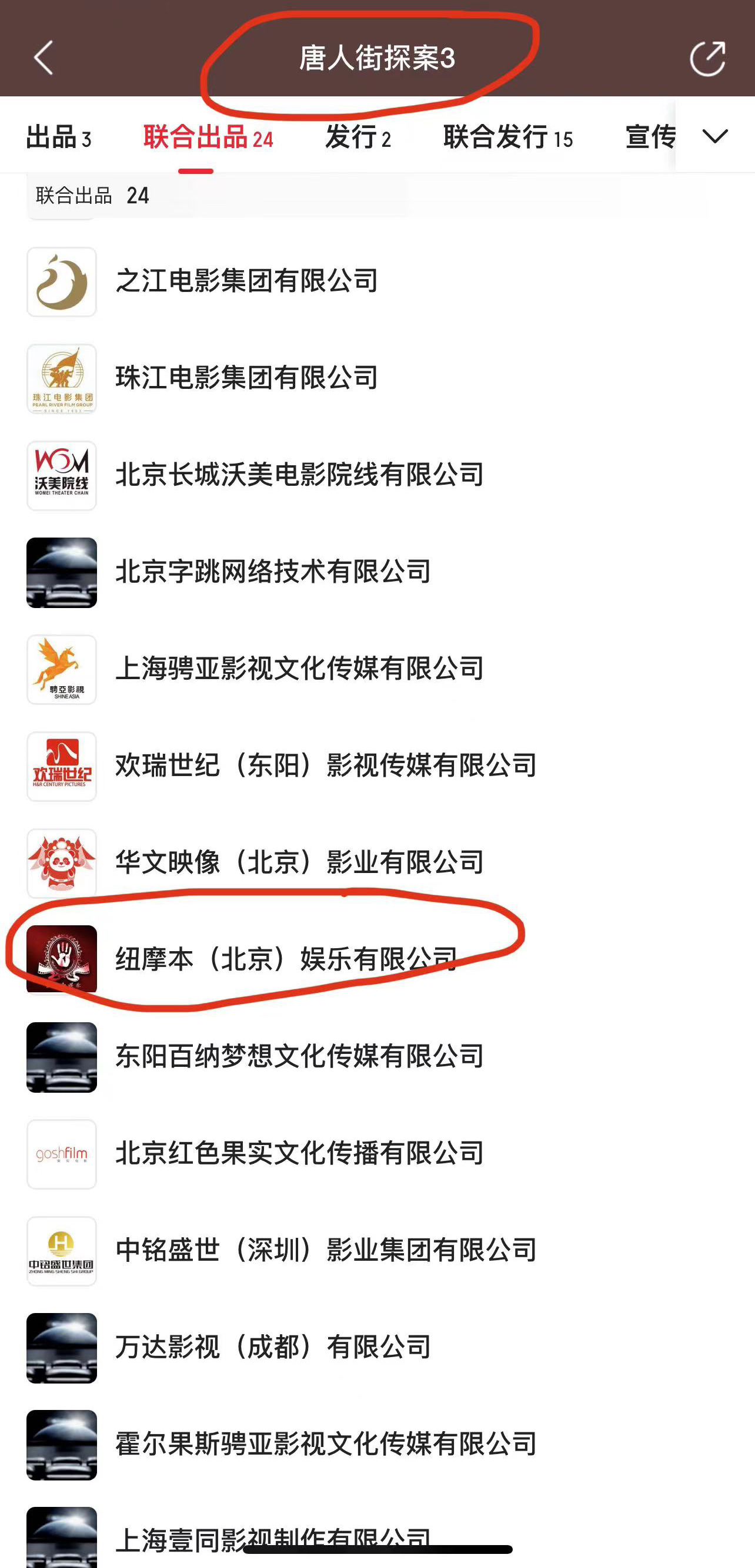 《唐探3》聯(lián)合出品方列表,來(lái)源:貓眼專(zhuān)業(yè)版