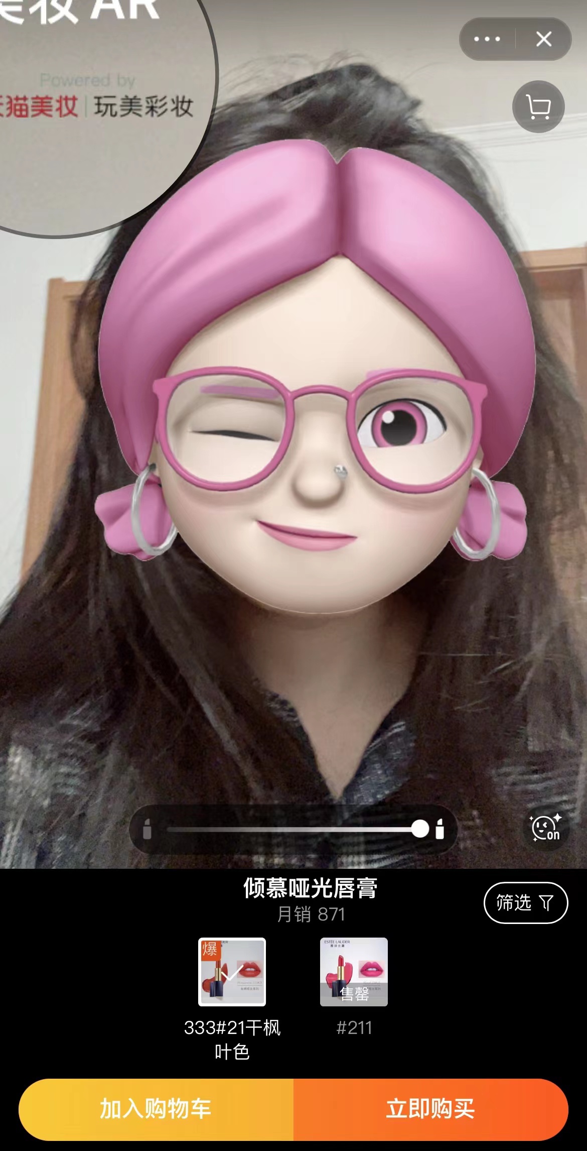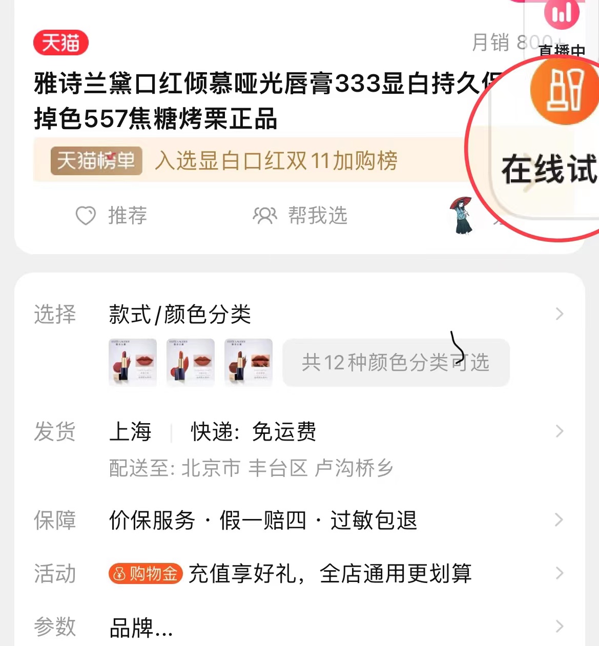 如何吸引?例如,記者搜索發(fā)現(xiàn)天貓部分彩妝旗艦店提供“線上試妝”服務(wù)。在雅詩(shī)蘭黛旗艦店的一款口紅頁(yè)面,試著點(diǎn)擊在線試妝后,可以滑動(dòng)相關(guān)按鈕,查看該色號(hào)的涂抹效果。而頁(yè)面左上角則顯示該技術(shù)屬于“玩美彩妝”。