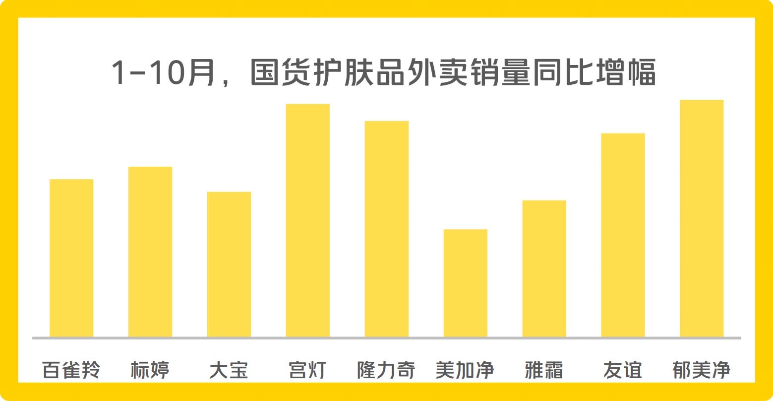 美團(tuán)數(shù)據(jù)顯示,今年1至10月,包含百雀羚、大寶、標(biāo)婷、隆力奇、美加凈、郁美凈、雅霜、宮燈、友誼等老牌國(guó)貨護(hù)膚品銷(xiāo)量,比去年同期增長(zhǎng)40%,其中,郁美凈、隆力奇、宮燈等品牌銷(xiāo)量同比增長(zhǎng)超過(guò)50%。