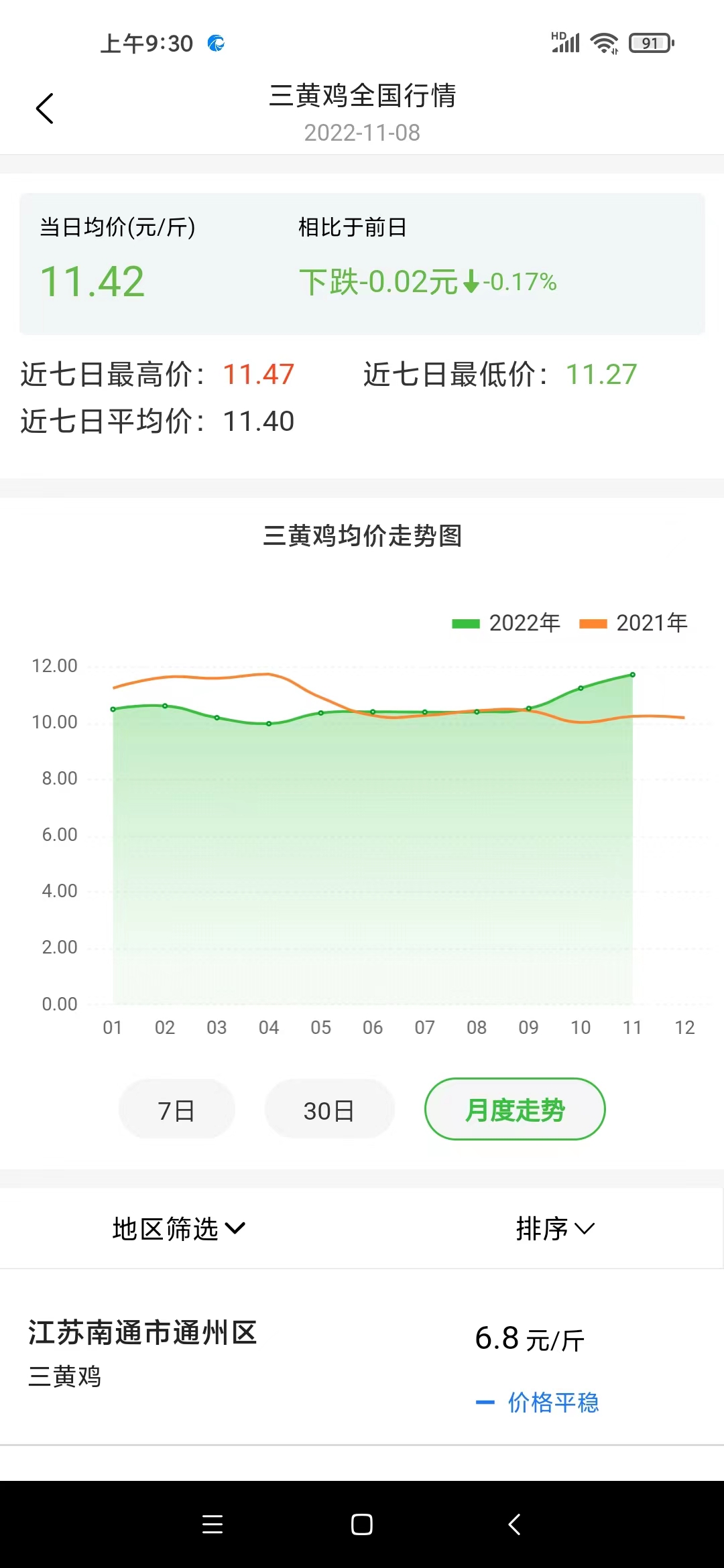 11月8日,記者走訪惠農(nóng)網(wǎng)大數(shù)據(jù)服務(wù)中心了解黃羽雞價(jià)格的最新進(jìn)展?;蒉r(nóng)網(wǎng)大數(shù)據(jù)分析師李彬彬介紹,“黃羽雞的種類(lèi)較多,以三黃雞為主。當(dāng)前,各地三黃雞價(jià)格普遍比較穩(wěn)定,安徽、江西、湖南、貴州、四川等地報(bào)價(jià)均在13元/公斤至17元/公斤區(qū)間內(nèi)。三黃雞價(jià)格確實(shí)有淡旺季之分,比較大的旺季是自9月份至次年5月份。在大旺季當(dāng)中也有月度波動(dòng),這與各地消費(fèi)多寡有關(guān),但是從月度價(jià)格指標(biāo)來(lái)看,總體是向上運(yùn)行的。”