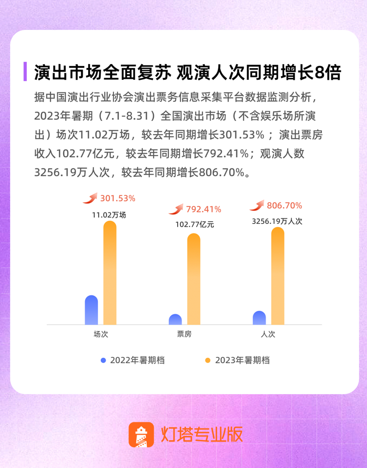 2023暑期檔(7月1日-8月31日)觀演人次3256.19萬(wàn)人次,較去年同期增長(zhǎng)806.70%;演出票房收入102.77億元,較去年同期增長(zhǎng)792.41%。