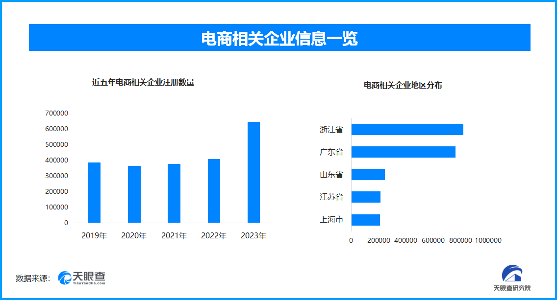 天眼查專業(yè)版數(shù)據(jù)顯示,截至目前,全國目前現(xiàn)存在業(yè)、存續(xù)狀態(tài)的電商相關(guān)企業(yè)約為375.5萬家,其中,2024年1月份-10月份新增注冊企業(yè)59.6萬余家;從電商企業(yè)年度注冊量可以看出,近5年來,電商相關(guān)企業(yè)注冊量一直保持高位增長,并于2023年達(dá)到頂峰。從地域分布來看,浙江省與廣東省兩個大省并駕齊驅(qū)位列榜首,注冊量分別為81.9萬家和76.2萬家;山東省、江蘇省、上海市位列其后,均為20萬家左右的量級。
