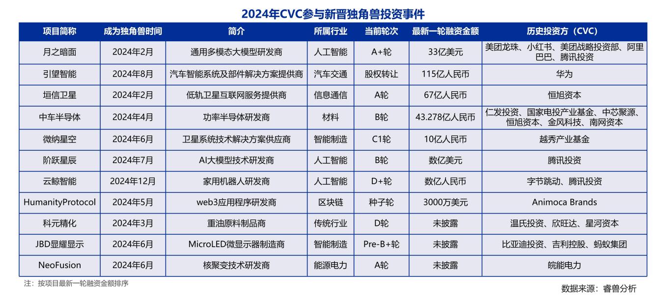大額投資占近四成,參與半數(shù)獨角獸投資。2024年,一級股權投資市場投資額過1億美元的大額投資事件83個,其中CVC參投31個,占比37.4%。其中2024年人工智能7個投資額超1億美元的大額事件中均有布局。獨角獸成長方面,CVC助力顯著,2024年國內新增20家獨角獸,其中11家有CVC參與投資,占比55%。