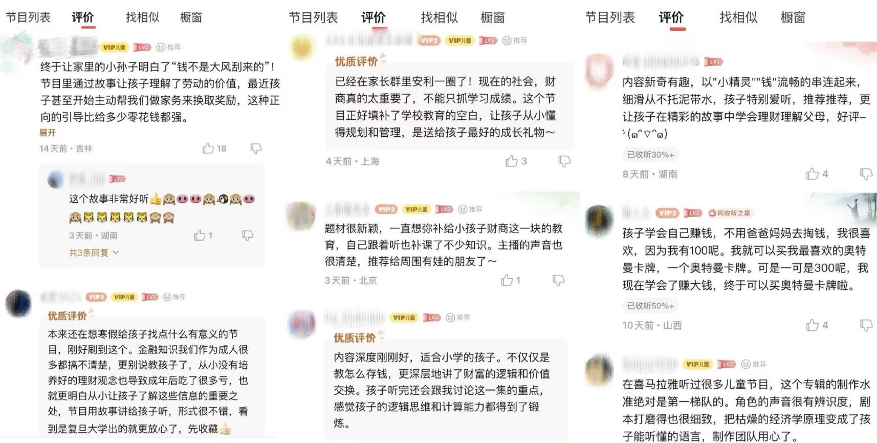 該廣播劇上線后,不少家長用戶在專輯評論區(qū)分享:“從小沒有培養(yǎng)好理財觀念導(dǎo)致成年后吃了很多虧,也就更明白從小讓孩子了解這些信息的重要之處。節(jié)目用故事講給孩子聽,形式很不錯”;“終于讓家里的小孫子明白了‘錢不是大風(fēng)刮來的’!節(jié)目里通過故事讓孩子理解了勞動的價值,最近孩子甚至開始主動幫我們做家務(wù)來換取獎勵,這種正向的引導(dǎo)比給多少零花錢都強(qiáng)”;“內(nèi)容深度剛剛好,適合小學(xué)的孩子。不僅僅是教怎么存錢,更深層次地講了財富的邏輯和價值交換。孩子聽完還會跟我討論這一集的重點(diǎn),感覺孩子的邏輯思維和計算能力都得到了鍛煉。”