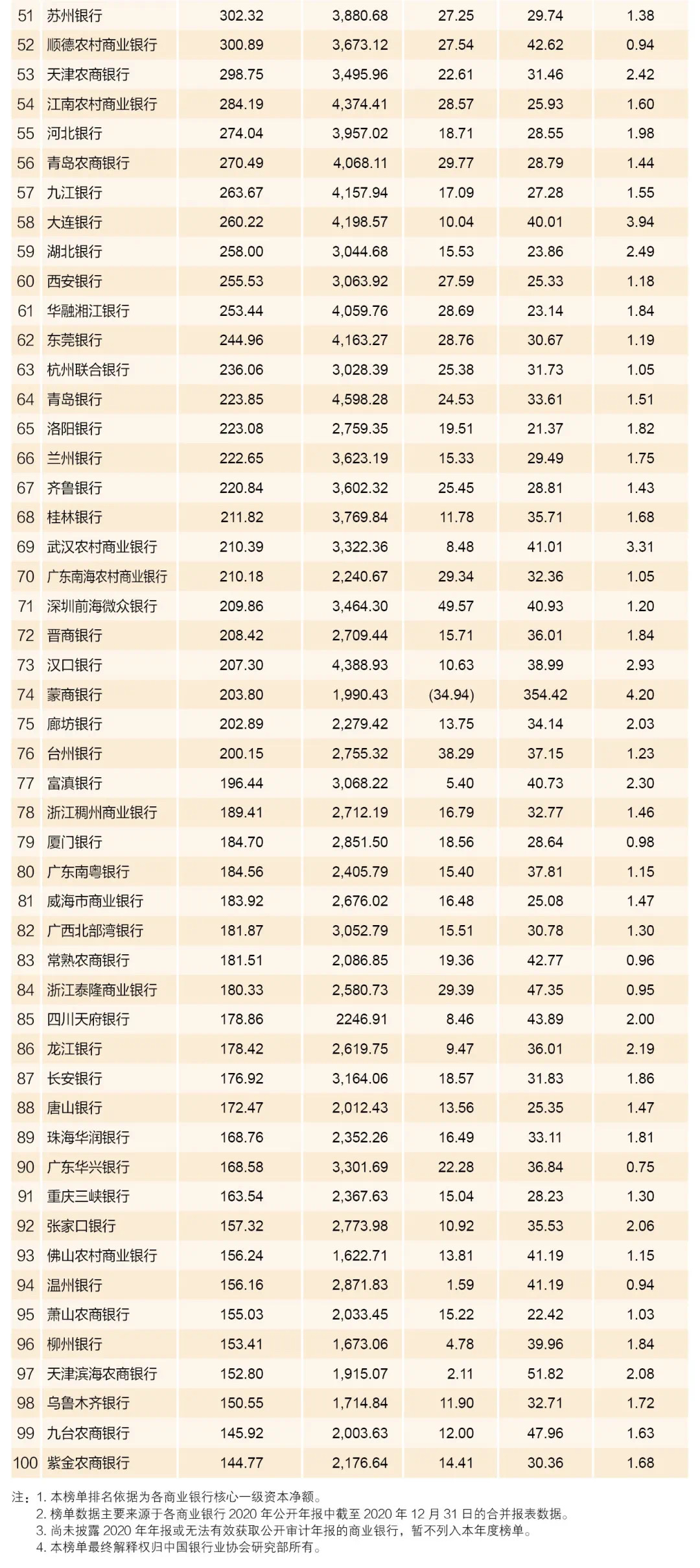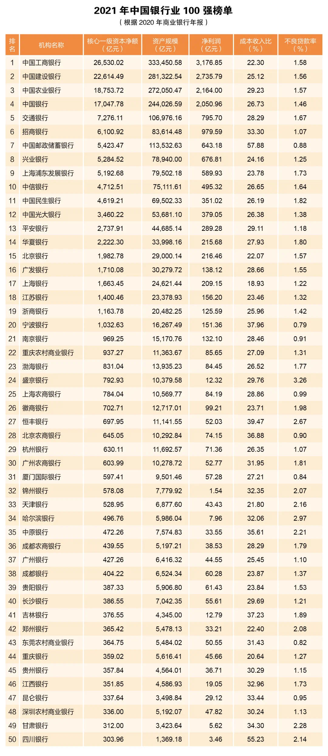本榜單參考巴塞爾協(xié)議Ⅲ和監(jiān)管機(jī)構(gòu)相關(guān)要求,按核心一級(jí)資本凈額排序,并對(duì)中國(guó)銀行業(yè)前100家銀行的經(jīng)營(yíng)規(guī)模、盈利能力、運(yùn)營(yíng)效率及資產(chǎn)質(zhì)量進(jìn)行綜合展示。為了確保榜單的權(quán)威性、客觀性及公正性,榜單數(shù)據(jù)主要來(lái)源于各商業(yè)銀行2020年公開年報(bào),并覆蓋所有中資商業(yè)銀行。本次上榜的100家銀行資產(chǎn)總和占商業(yè)銀行總資產(chǎn)的90.04%,創(chuàng)造了商業(yè)銀行97.15%的凈利潤(rùn),包括6家大型銀行,12家全國(guó)性股份制商業(yè)銀行,61家城市商業(yè)銀行、20家農(nóng)村商業(yè)銀行和1家民營(yíng)銀行。