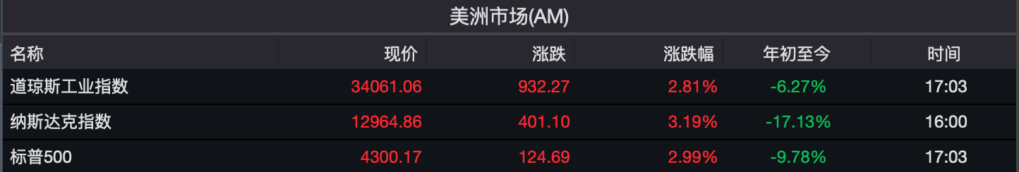 在利率決議公布及鮑威爾講話提振后,美股三大指數(shù)大幅收漲,道指漲2.81%,納指漲3.19%,標(biāo)普500指數(shù)漲2.99%。