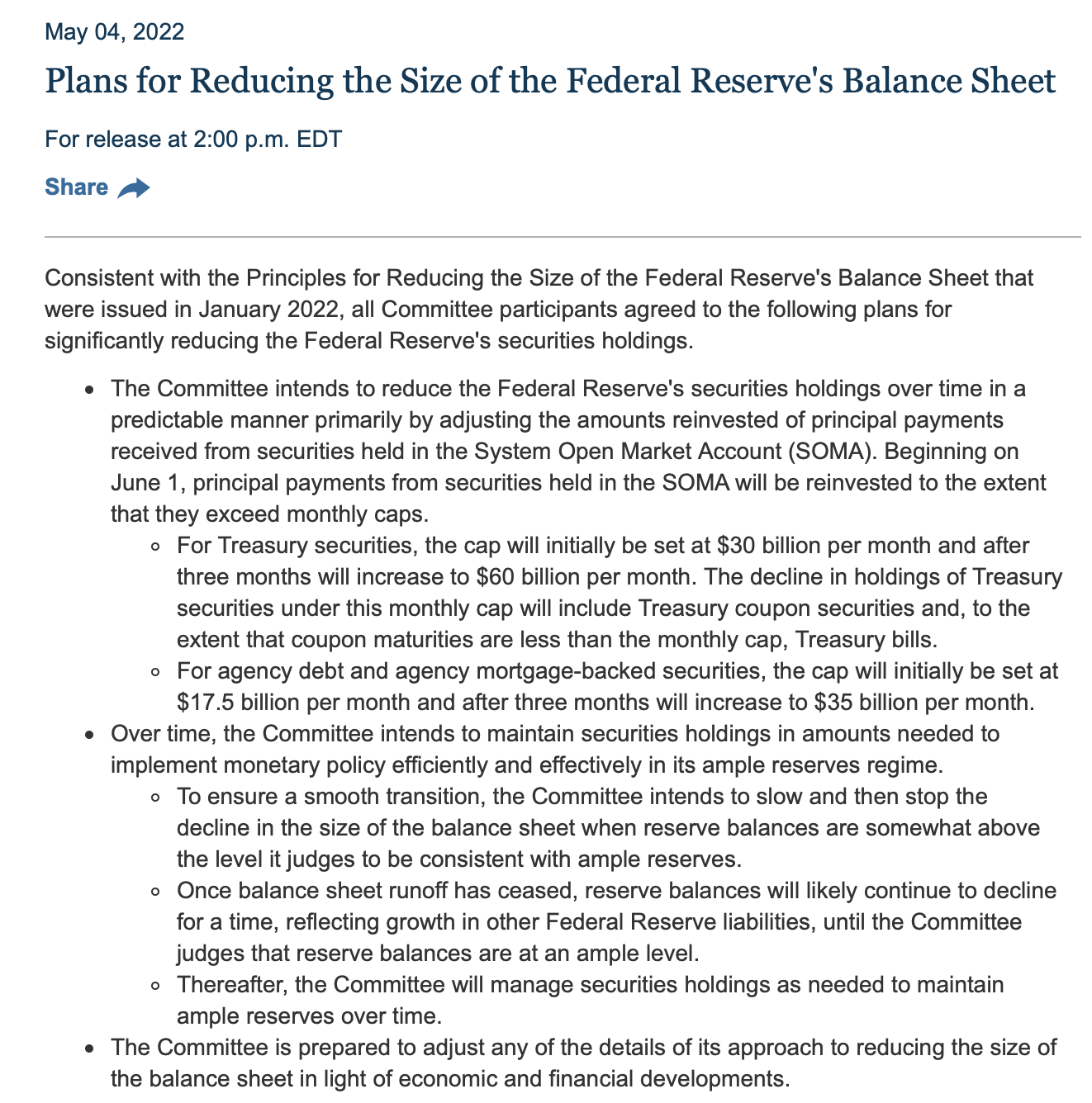 另外,據(jù)美聯(lián)儲FOMC聲明顯示,委員會決定從6月1日開始減少其持有的國債、機構(gòu)債務(wù)和機構(gòu)抵押貸款支持證券。根據(jù)縮表計劃,美聯(lián)儲將從6月開始以每個月475億美元的速度縮表,其中美債300億元美元,機構(gòu)債務(wù)和機構(gòu)抵押貸款支持證券為175億美元;三個月之后,每個月的縮表力度將擴大至最高950億美元,其中美債600億元美元,機構(gòu)債務(wù)和機構(gòu)抵押貸款支持證券為350億美元。