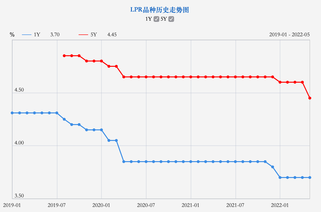 據(jù)中國人民銀行授權(quán)全國銀行間同業(yè)拆借中心公布,2022年5月20日貸款市場報(bào)價(jià)利率(LPR)為:1年期LPR為3.7%,5年期以上LPR為4.45%。二者前值分別為3.7%、4.6%。
