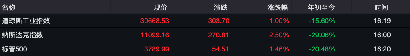 激進(jìn)加息落地后,美股表現(xiàn)較為積極。道瓊斯指數(shù)收?qǐng)?bào)30668.53點(diǎn),上漲1.00%;納斯達(dá)克指數(shù)收?qǐng)?bào)11099.16點(diǎn),上漲2.50%;標(biāo)普500指數(shù)收?qǐng)?bào)3789.99點(diǎn),上漲1.46%。