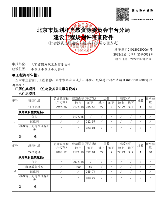 北京首鋼海賦置業(yè)有限公司于2022年6月1日通過掛牌出讓形式取得豐臺區(qū)小瓦窯村XWY-13地塊項目建設用地使用權(quán),拿地后僅30天就取得了建設工程規(guī)劃許可證,繼華潤置地紀家廟項目后,再次刷新了豐臺區(qū)集中供地以來辦理建設工程規(guī)劃許可證的記錄。