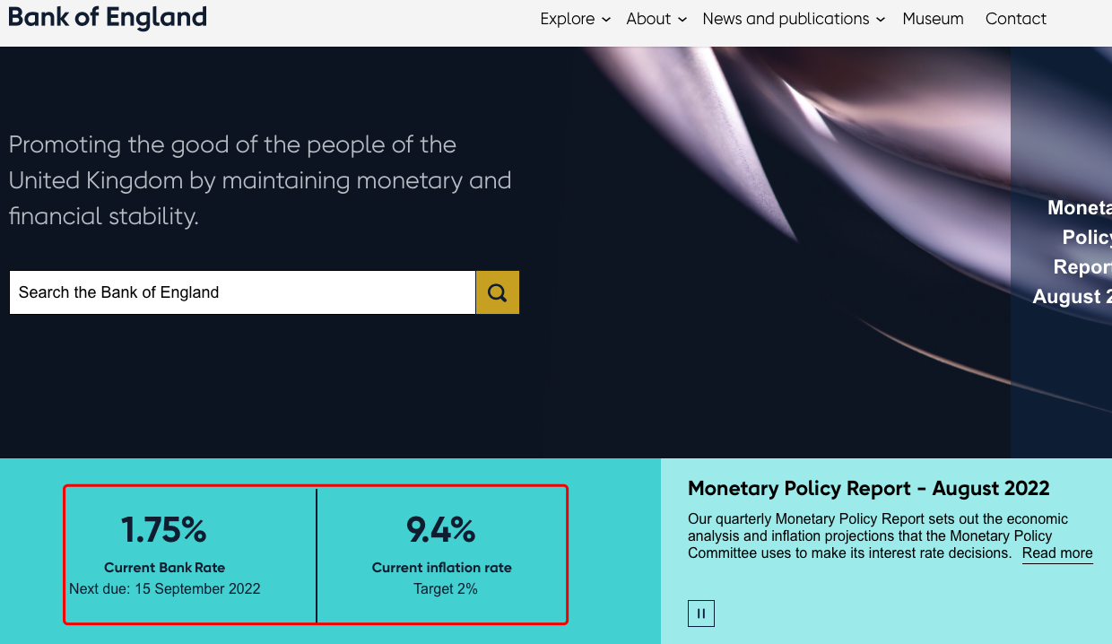(圖說(shuō):英國(guó)央行將基準(zhǔn)利率提升至1.75%,當(dāng)前英國(guó)的通脹率已高達(dá)9.4%,超目標(biāo)2%四倍多;圖片來(lái)源:英國(guó)央行官網(wǎng))