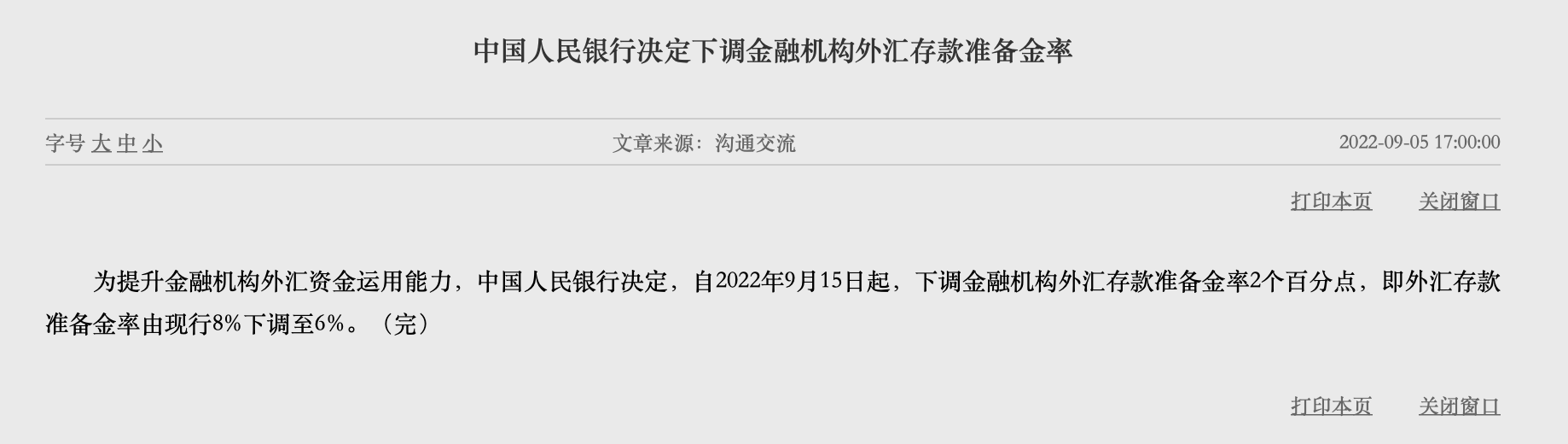 為提升金融機構(gòu)外匯資金運用能力,中國人民銀行決定,自2022年9月15日起,下調(diào)金融機構(gòu)外匯存款準備金率2個百分點,即外匯存款準備金率由現(xiàn)行8%下調(diào)至6%。