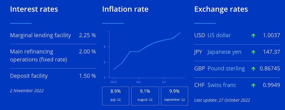 據新華財經消息,北京時間10月27日晚,歐洲央行召開貨幣政策會議,宣布再次將三大關鍵利率大幅上調75個基點,調整后的利率將于11月2日生效。