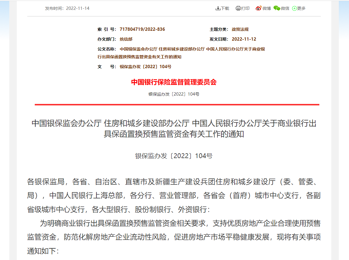 為支持優(yōu)質(zhì)房地產(chǎn)企業(yè)合理使用預(yù)售監(jiān)管資金,防范化解房地產(chǎn)企業(yè)流動(dòng)性風(fēng)險(xiǎn),促進(jìn)房地產(chǎn)市場(chǎng)平穩(wěn)健康發(fā)展,11月14日,中國(guó)銀保監(jiān)會(huì)、住房和城鄉(xiāng)建設(shè)部、人民銀行聯(lián)合發(fā)布《關(guān)于商業(yè)銀行出具保函置換預(yù)售監(jiān)管資金有關(guān)工作的通知》(以下簡(jiǎn)稱《通知》),指導(dǎo)商業(yè)銀行按市場(chǎng)化、法治化原則,向優(yōu)質(zhì)房地產(chǎn)企業(yè)出具保函置換預(yù)售監(jiān)管資金。