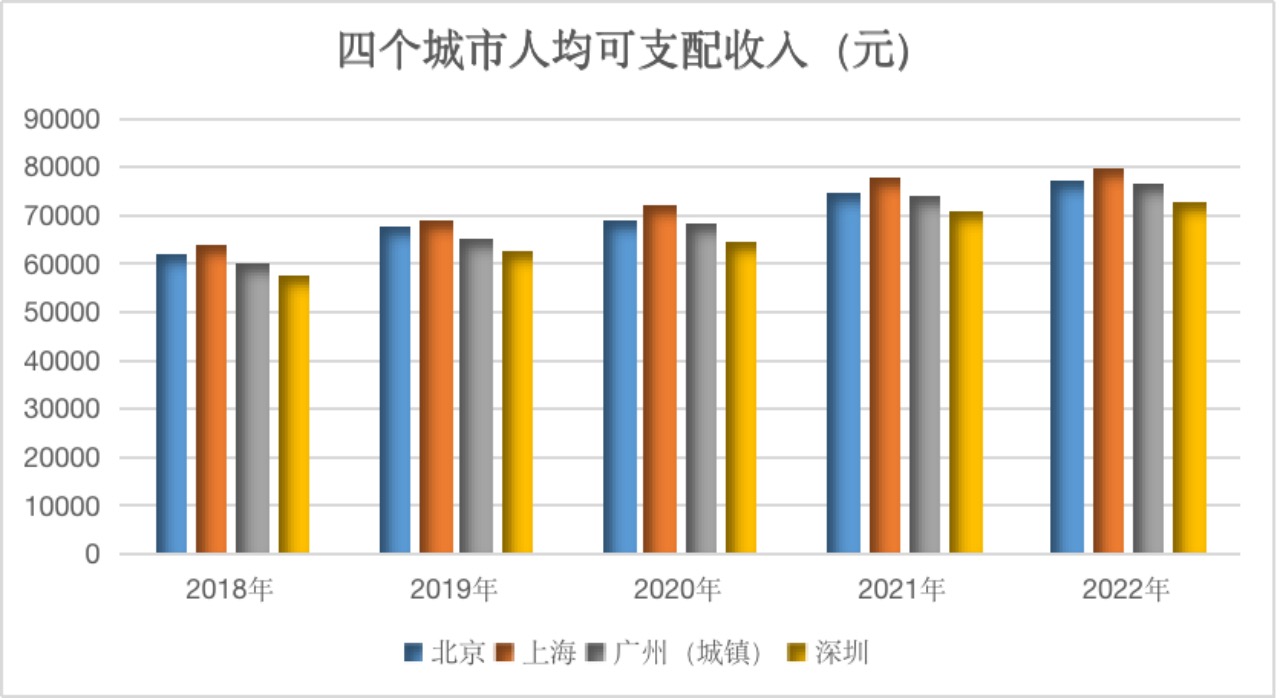 下圖為過去五年北京、上海、廣州和深圳居民人均可支配收入: