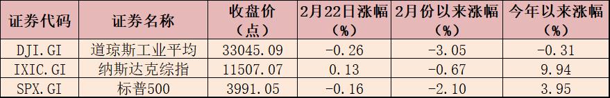 受消息面影響,當(dāng)?shù)貢r(shí)間2月22日,美股三大指數(shù)收盤(pán)漲跌不一,道瓊斯指數(shù)跌0.26%,報(bào)33045.09點(diǎn);標(biāo)普500指數(shù)跌0.16%,報(bào)3991.05點(diǎn);納斯達(dá)克指數(shù)漲0.13%,報(bào)11507.07點(diǎn)。值得注意的是,標(biāo)普500指數(shù)已連續(xù)4個(gè)交易日下跌。
