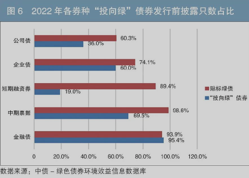 從綠債環(huán)境效益信息披露情況看,《報(bào)告》指出,參考中債綠色指標(biāo)體系,根據(jù)中債-綠色債券環(huán)境效益信息數(shù)據(jù)庫(以下簡稱“中債綠債數(shù)據(jù)庫”)的綠債發(fā)行前環(huán)境效益信息數(shù)據(jù)統(tǒng)計(jì),2022年我國公開發(fā)行“投向綠”債券964只,在發(fā)行前階段披露環(huán)境效益信息的有514只,披露只數(shù)占比為53.3%。公開發(fā)行貼標(biāo)綠債391只,在發(fā)行前階段披露環(huán)境效益信息的有331只,披露只數(shù)占比為84.7%。在“投向綠”債券中,金融債的披露只數(shù)占比最高,達(dá)95%;中期票據(jù)、企業(yè)債券次之,披露只數(shù)占比均超過60%。在貼標(biāo)綠債中,中期票據(jù)、金融債、短期融資券披露環(huán)境效益的只數(shù)占比較高,均達(dá)到90%左右。