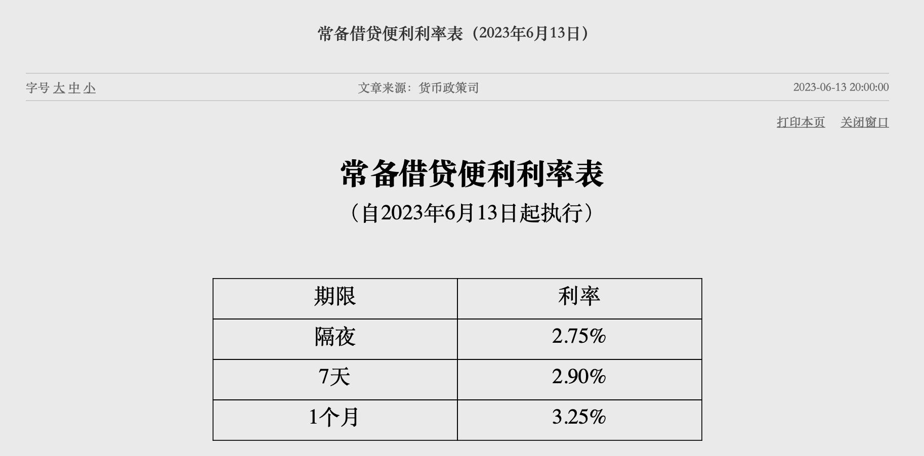 6月13日晚間,央行下調(diào)常備借貸便利利率,隔夜期下調(diào)10個(gè)基點(diǎn)至2.75%,7天期下調(diào)10個(gè)基點(diǎn)至2.9%,1個(gè)月期下調(diào)10個(gè)基點(diǎn)至3.25%。