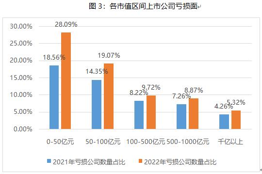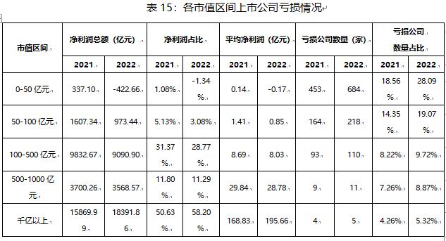 將實(shí)體類(lèi)上市公司按照市值區(qū)間劃分,虧損公司主要發(fā)生在市值500億元以下的公司類(lèi)型中,有1012家公司虧損,其中:(1)市值50億元以下的公司,有684家公司虧損,虧損面28.09%,虧損面比上年(18.56%)增加了近10個(gè)百分點(diǎn),這類(lèi)公司凈利潤(rùn)總額發(fā)生絕對(duì)虧損,虧損總金額422.66億元;(2)市值50-100億元的公司,有218家公司虧損,虧損面為19.07%,比上年(14.35%)增加近5個(gè)百分點(diǎn);(3)市值100-500億元的公司,有110家公司虧損,虧損面9.72%,比上年(8.22%)增加1.5個(gè)百分點(diǎn);(4)市值500-1000億元的公司,有11家公司虧損,虧損面8.87%,比上年(7.26%)增加1.61個(gè)百分點(diǎn);(5)市值1000億元以上的公司有5家虧損,虧損面5.32%,比上年(4.26%)增加1.06個(gè)百分點(diǎn)。上述可見(jiàn),隨著市值區(qū)間的提升,虧損上市公司數(shù)量和虧損面都在絕對(duì)下降。