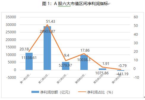 2022年,A股市場(chǎng)頭部效應(yīng)顯著,高市值上市公司經(jīng)營(yíng)業(yè)績(jī)表現(xiàn)極為優(yōu)秀。將A股上市公司按照市值分成六大區(qū)間(見(jiàn)下表),數(shù)據(jù)顯示,千億市值以上的上市公司數(shù)量為122家,占比2.41%,市值規(guī)模達(dá)到34.71萬(wàn)億元,占比40.99%。從盈利指標(biāo)來(lái)看,千億級(jí)上市公司的營(yíng)業(yè)收入總額達(dá)到32.35萬(wàn)億元,占比45.38%;凈利潤(rùn)總額達(dá)到4.02萬(wàn)億元,占比71.61%。其中,萬(wàn)億市值以上的上市公司有5家,分別為貴州茅臺(tái)、工商銀行、建設(shè)銀行、中國(guó)移動(dòng)、農(nóng)業(yè)銀行,其合計(jì)總市值、營(yíng)業(yè)收入、凈利潤(rùn)分別為6.76萬(wàn)億元,3.53萬(wàn)億元和1.13萬(wàn)億元,占A股上市公司相同指標(biāo)總額的比重分別為7.99%、4.95%和20.18%;其平均凈利潤(rùn)和營(yíng)業(yè)收入分別達(dá)到2267.72億元和7053.38億元,均遠(yuǎn)超其他類(lèi)別的上市公司。