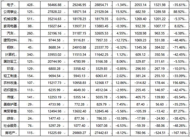 凈利潤(rùn)出現(xiàn)虧損且虧損面在30%以上的有7大行業(yè),分別是社會(huì)服務(wù)、綜合、傳媒、計(jì)算機(jī)、商貿(mào)零售、房地產(chǎn)和紡織服飾,其虧損面和虧損上市公司家數(shù)分別為48.68%(37家)、45.83%(11家)、34.75%(49家)、34.41%(117家)、33.98%(35家)、33.91(39家)和33.63%(38家)。其中前兩大行業(yè)的占比更是接近50%,此外,計(jì)算機(jī)和醫(yī)藥生物的虧損公司數(shù)量分別達(dá)到117家和100家,行業(yè)經(jīng)營(yíng)業(yè)績(jī)壓力較大。