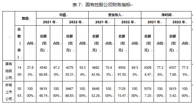 相較于民營(yíng)控股公司,國(guó)有控股公司有1409家,數(shù)量占比27.83%,不足A股市場(chǎng)總公司數(shù)量的1/3,但其市值占比已于2022年超過(guò)50%,且營(yíng)業(yè)收入和凈利潤(rùn)持續(xù)保持同比增長(zhǎng),分別達(dá)到了49.57萬(wàn)億元,占比69.53%,和4.36萬(wàn)億元,占比77.55%,是上市公司增長(zhǎng)的主要貢獻(xiàn)者。