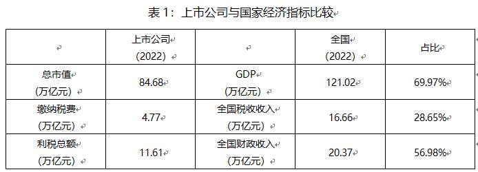 2022年,A股上市公司共繳納稅費(fèi)4.77萬(wàn)億元,占全國(guó)稅收收入總額(16.66萬(wàn)億元)的28.65%;上市公司總利稅為11.61萬(wàn)億元,占全國(guó)財(cái)政收入的56.98%。