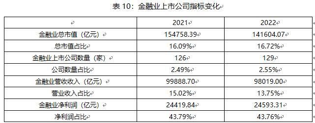 2022年,金融業(yè)上市公司數(shù)量增加了3家,達(dá)129家,總市值14.16萬(wàn)億元,相較于2021年下降了8.50%,數(shù)量和總市值分別占A股公司總量的2.55%和16.72%。金融業(yè)上市公司當(dāng)年的營(yíng)收和凈利潤(rùn)增速有所放緩,其中,營(yíng)業(yè)收入為9.80萬(wàn)億元,同比下降1.87%,比上年減少了1.28個(gè)百分點(diǎn);但創(chuàng)利水平穩(wěn)定,凈利潤(rùn)達(dá)2.45萬(wàn)億元,同比上升0.71%。雖然金融業(yè)上市公司占A股公司總量的比例僅為2.55%,但是其創(chuàng)造的凈利潤(rùn)占A股凈利潤(rùn)總額的比重高達(dá)43.76%,幾近半壁江山。