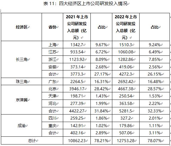 從長(zhǎng)三角、珠三角、京津冀和成渝四個(gè)經(jīng)濟(jì)區(qū)的上市公司研發(fā)投入情況來(lái)看,京津冀的研發(fā)投入總額及占比均為兩年最高,長(zhǎng)三角次之。其中,北京2022年上市公司研發(fā)投入總額達(dá)到4667.38億元,占比近30%,遠(yuǎn)超其他省份,而各經(jīng)濟(jì)區(qū)上市公司研發(fā)投入的穩(wěn)定增長(zhǎng)正是響應(yīng)創(chuàng)新驅(qū)動(dòng)發(fā)展戰(zhàn)略的重要表現(xiàn)。