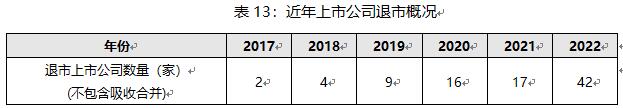 2022年,A股市場(chǎng)共計(jì)退市42家上市公司,創(chuàng)下退市數(shù)量新高,其中,有24家上市公司因被*ST后首個(gè)會(huì)計(jì)年度被會(huì)計(jì)師事務(wù)所出具無(wú)法表示意見(jiàn)或者否定意見(jiàn)的審計(jì)報(bào)告而退市,“非標(biāo)退市”已經(jīng)成為推動(dòng)資本市場(chǎng)優(yōu)勝劣汰中非常重要的一環(huán),1家上市公司因連續(xù)20個(gè)交易日的每日股票收盤(pán)價(jià)均低于人民幣1元而被退市。板塊情況來(lái)看,不同板塊退市公司數(shù)量分別為滬主板18家、深主板16家、創(chuàng)業(yè)板8家。行業(yè)情況來(lái)看,退市公司數(shù)量最多的前4個(gè)行業(yè)分別為傳媒(7家)、非銀金融(4家)、醫(yī)藥生物(3家)、社會(huì)服務(wù)(3家)。隨著注冊(cè)制改革的進(jìn)一步深化,可以預(yù)見(jiàn)上市公司退市將逐步常態(tài)化,上市公司只有堅(jiān)守合規(guī)底線(xiàn),才能保證基業(yè)長(zhǎng)青。